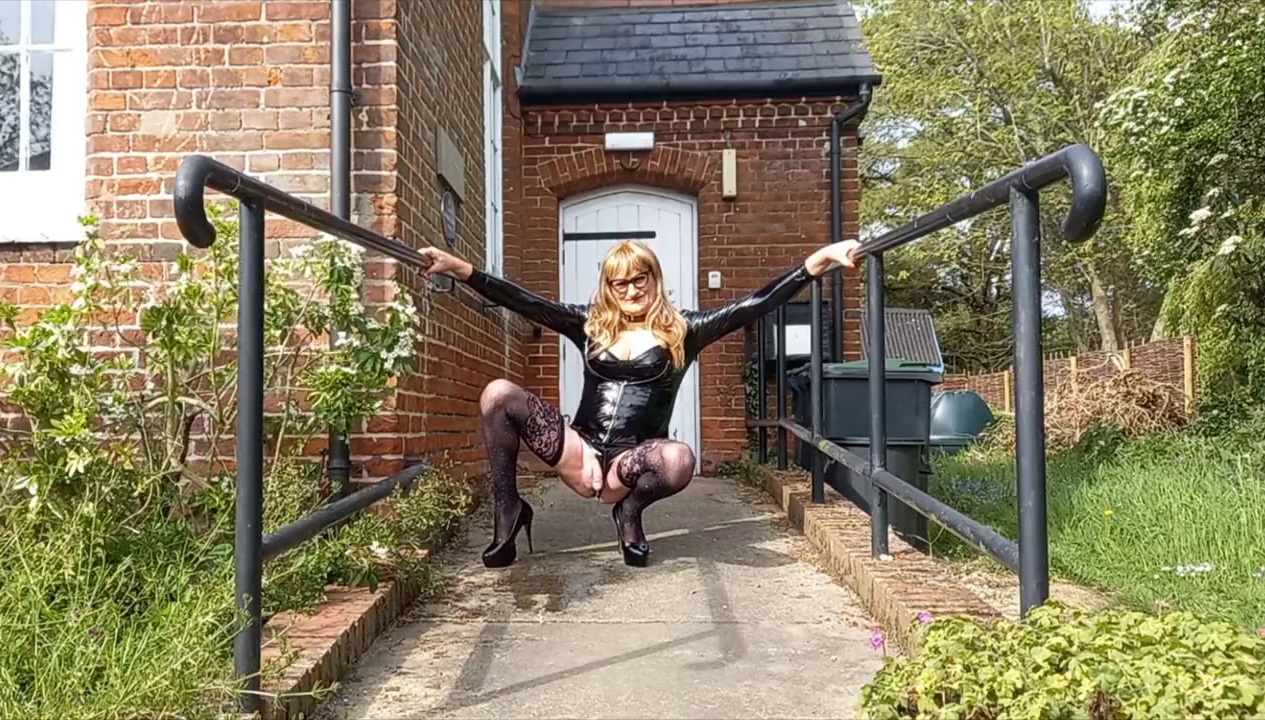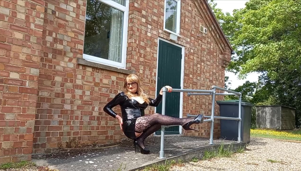 Tgirl tranny slut squating for a piss, wearing black shiny pvc