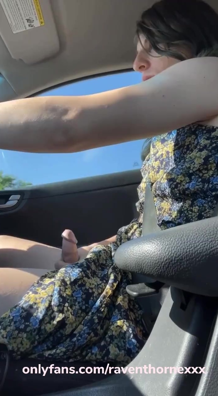 Cute trans girl Raven Thorne strokes her pretty cock while driving until she cums all over herself.