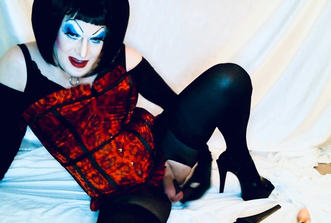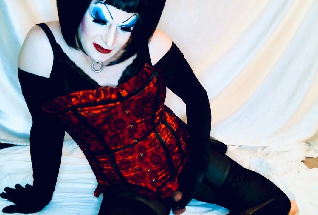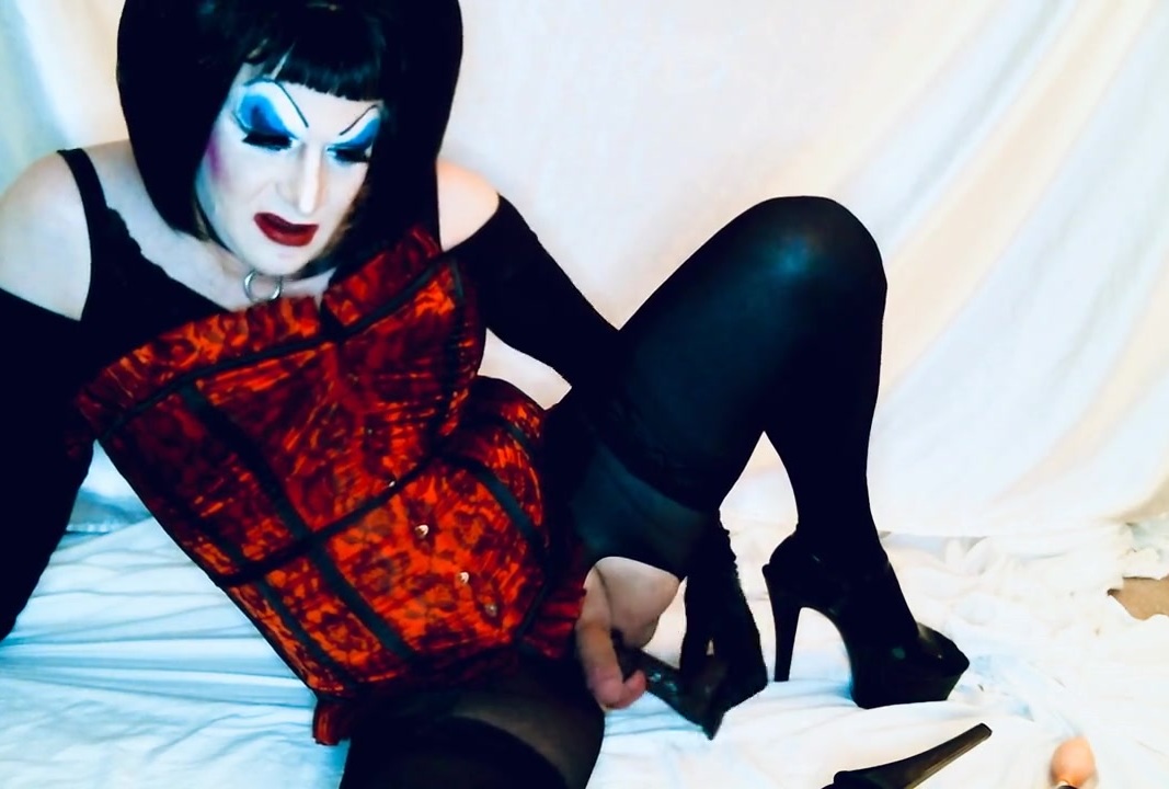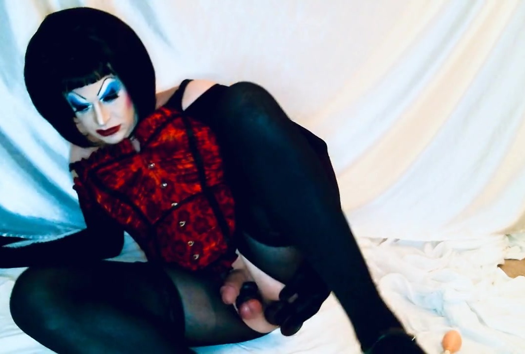 Sissy Cockslut in powerful make-up satisfies Father by pounding BIG BLACK COCK faux-cock