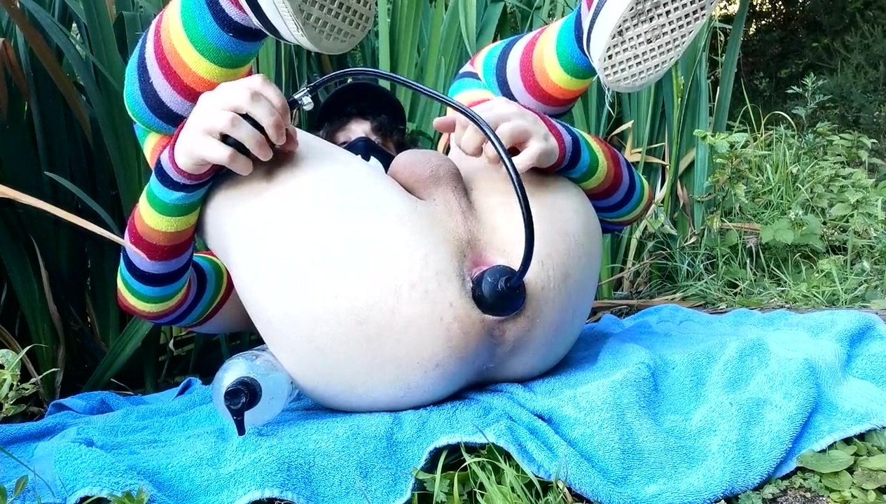Thin femboy bitch Raine using a yam-sized inflatable faux-cock outdoors in nature!
