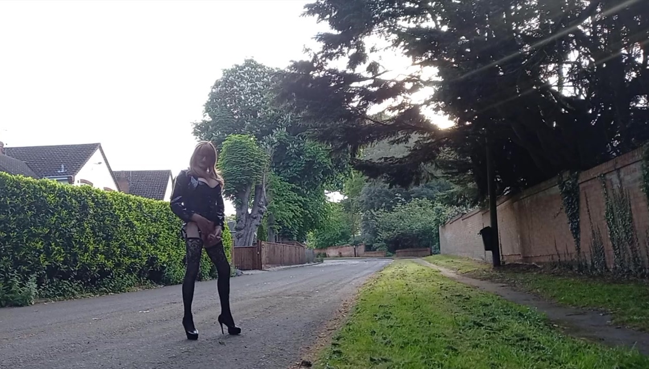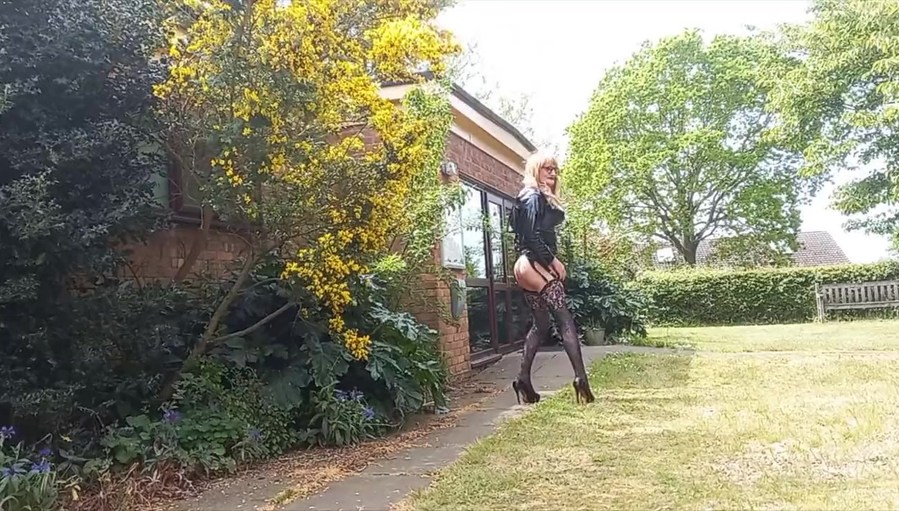 Tranny Slut Gina fucks huge dildo outdoors on a chair