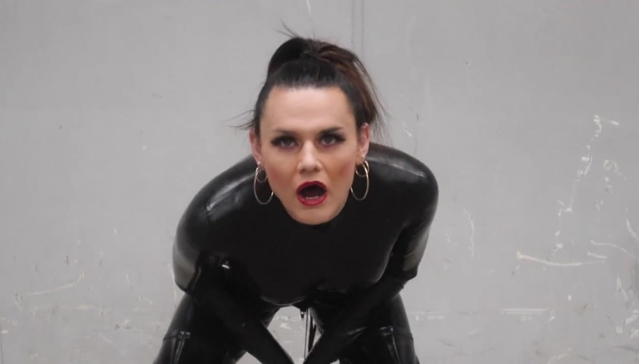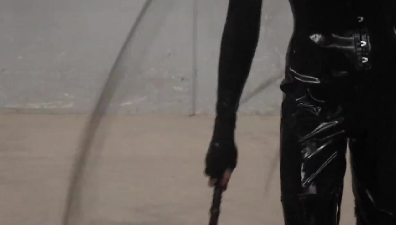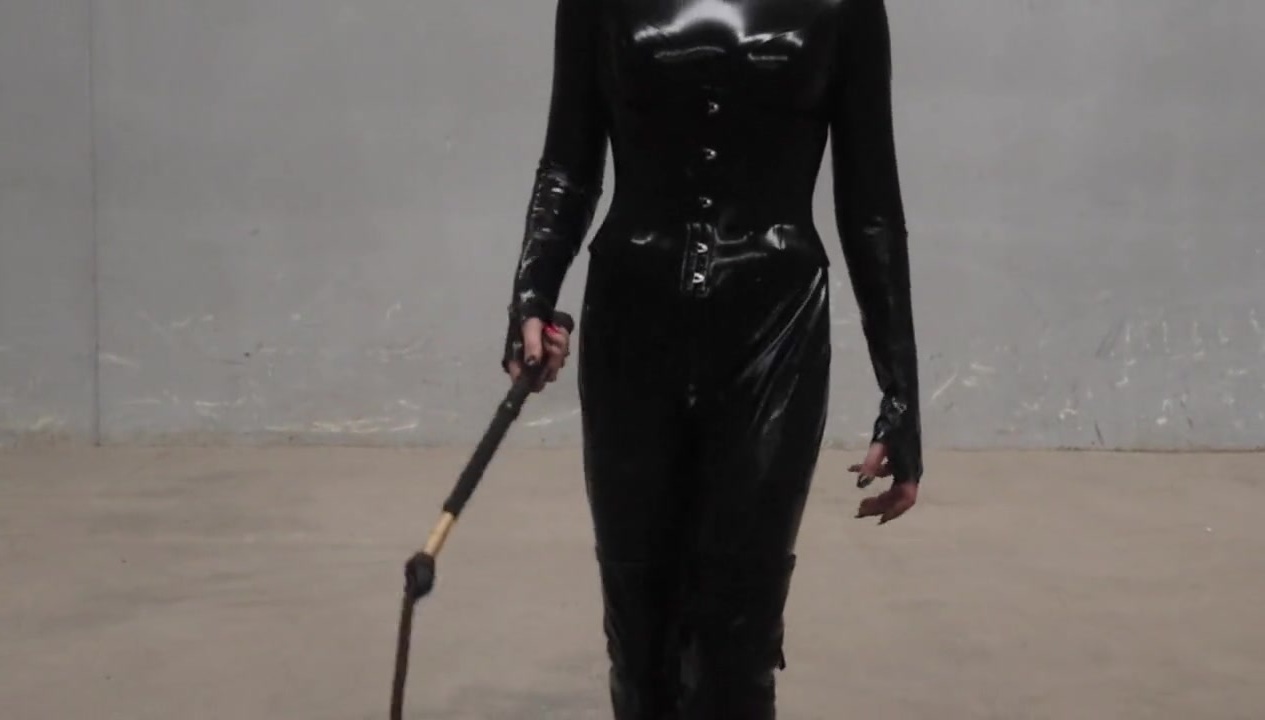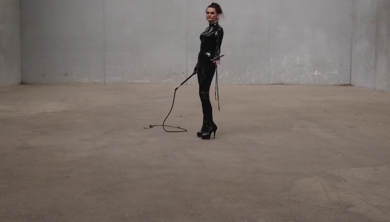 Towering Australian transgender dominatrix Obsidian struts in her latex catsuit whilst cracking her bullwhip.