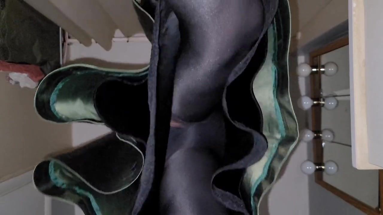 Green lined satin skirt with a silky lining and a black satin half slip with glossy pantyhose underneath my office desk. Satin clothing. Lined skirt.