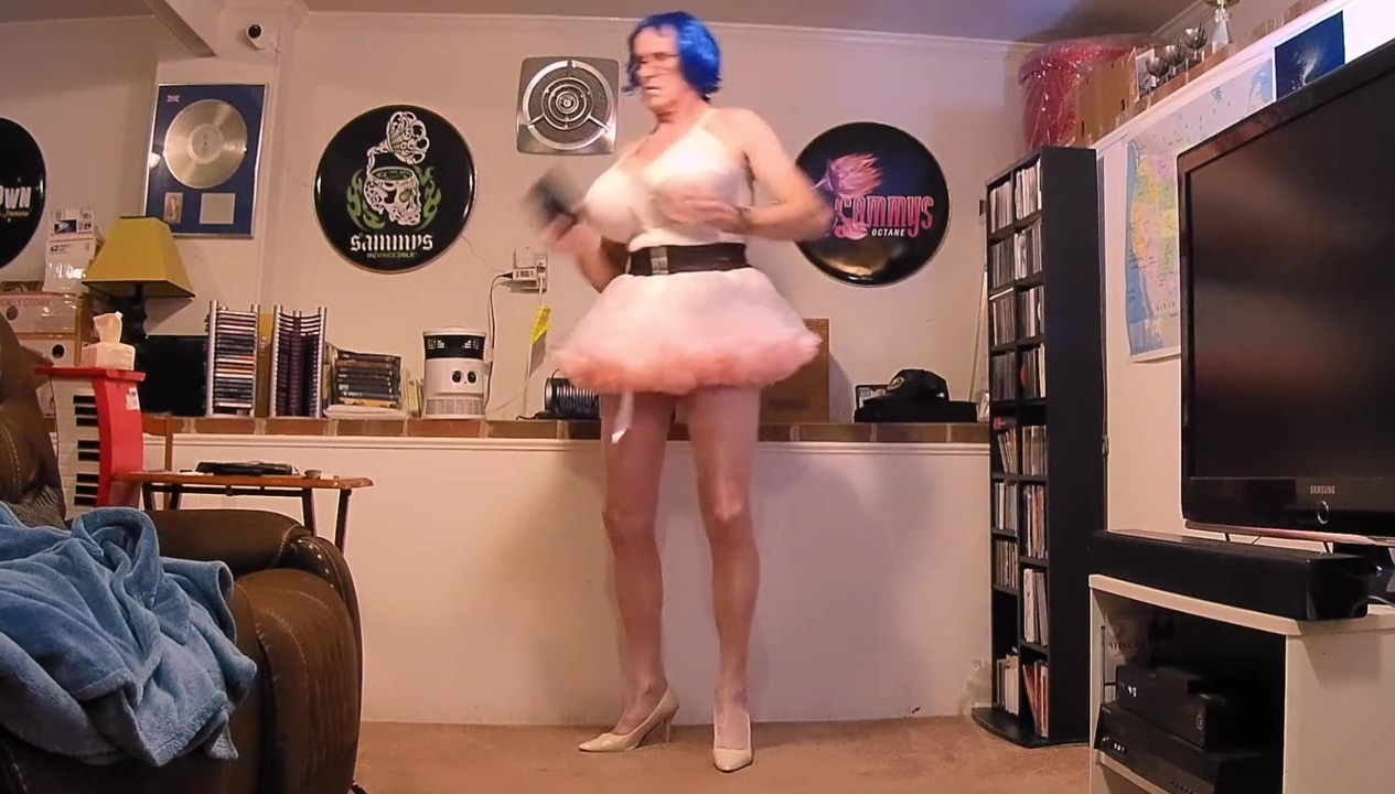 back in my white petticoat, a bit of parading around, then gradually stripping off to a big cumshot in the kitchen