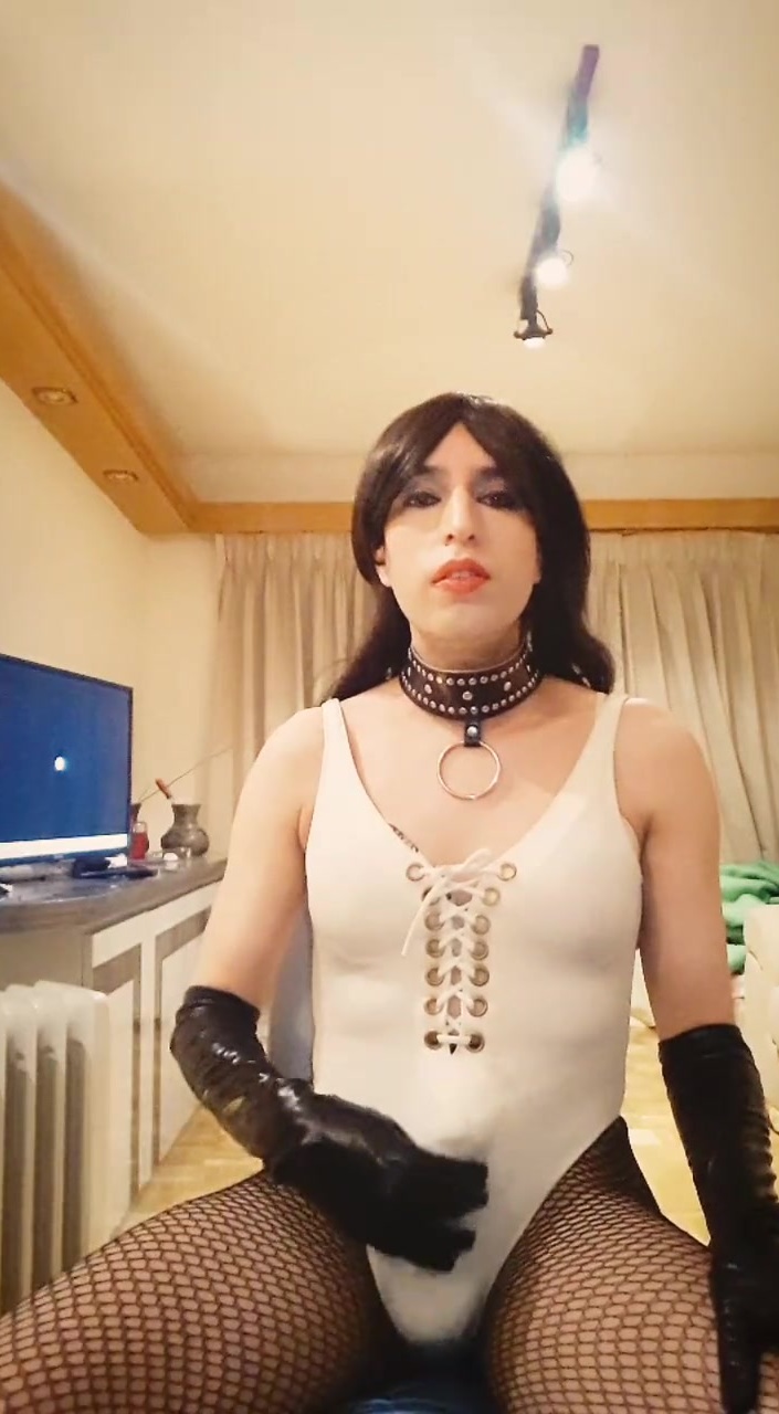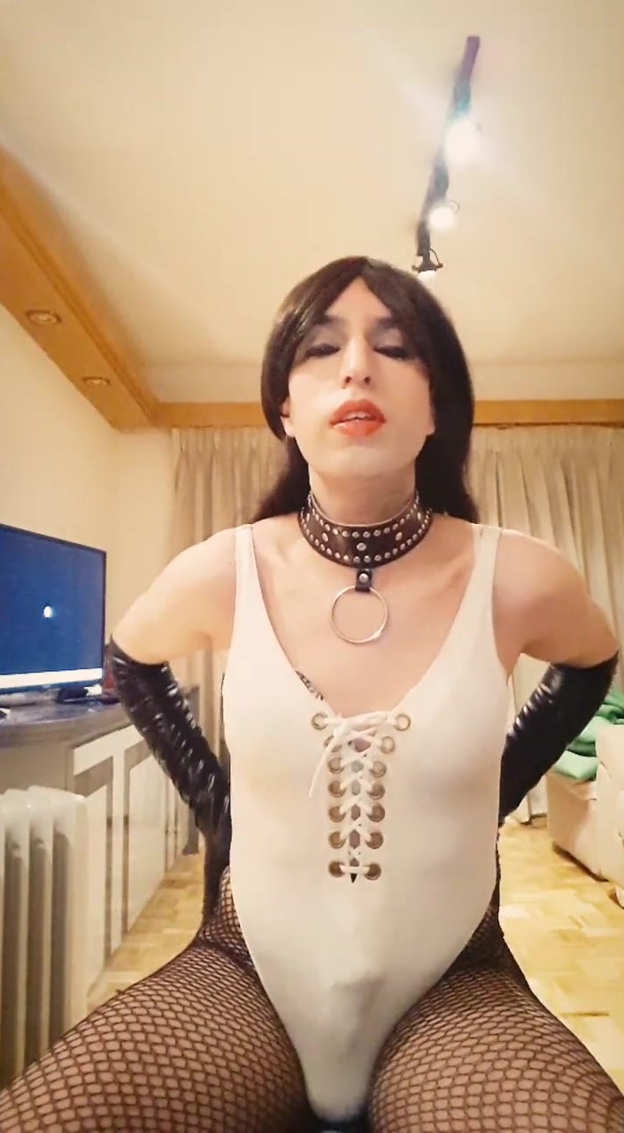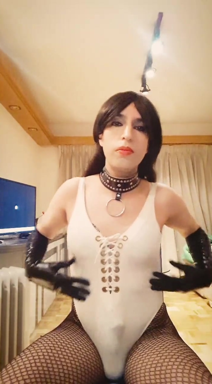 Sissy crossdresser in white swimsuit masturbates thinking about dominant males, wanting to get one or more to subdue her and expose her like a real sissy cocksucker. She is so excited thinking in that