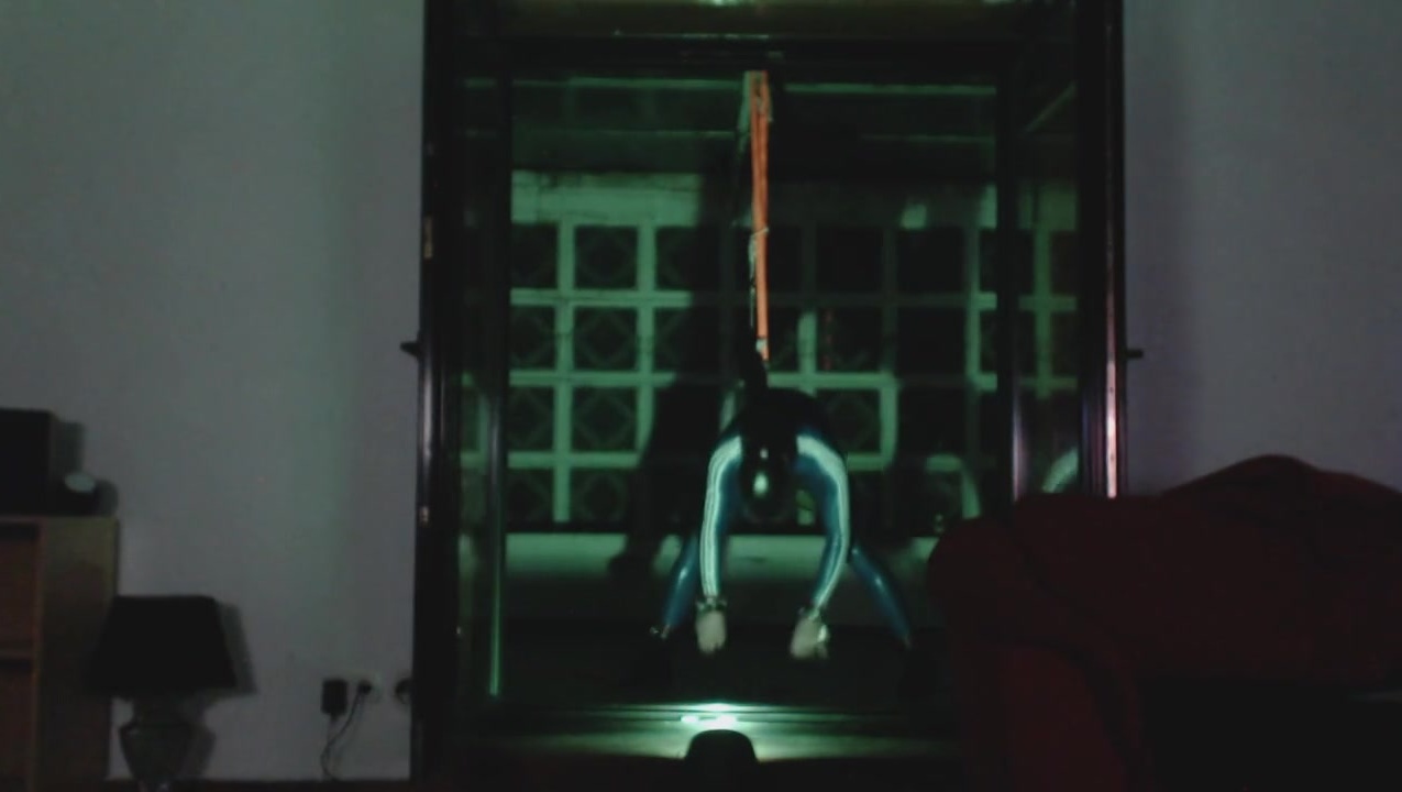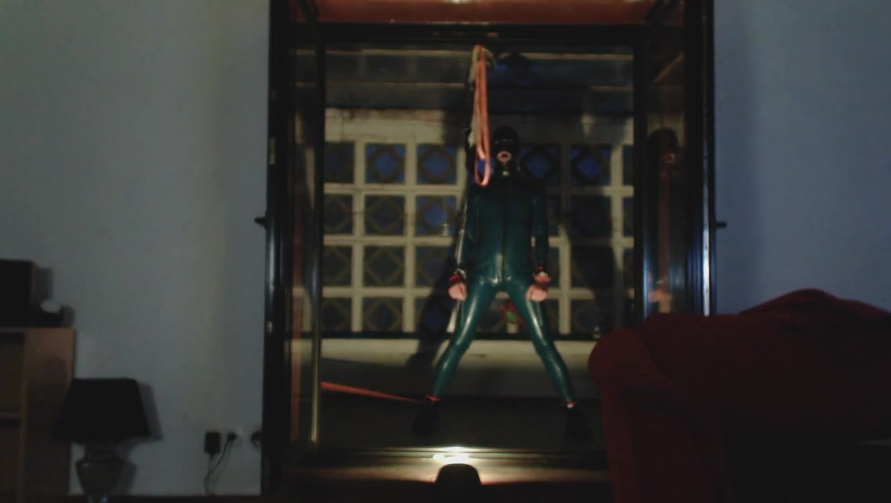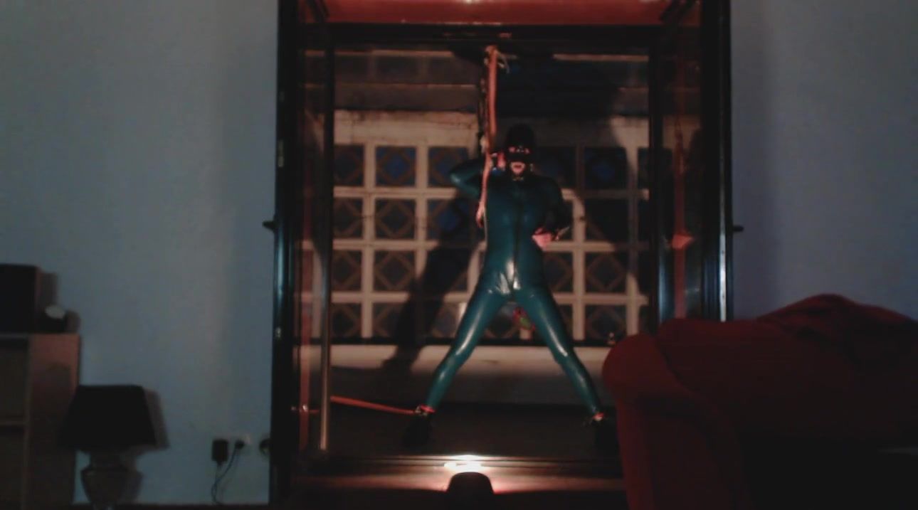 Selfbondage in full latex gear. Ringgag and buttplug.
