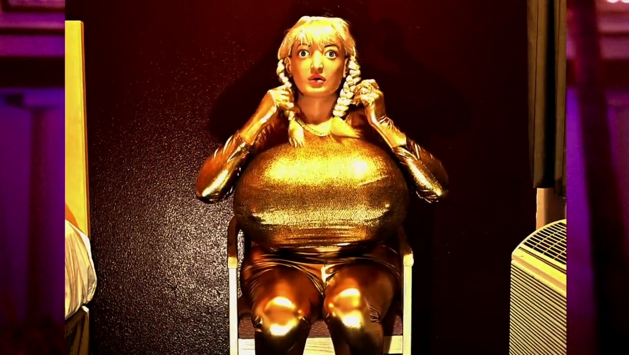 Juggsy is a female masking rubber doll. Juggsy performs bra fetish with 21xl breast forms and a 42 P Cup black lace bra. Tight golden spandex and braided blonde hair create a cute golden doll look!