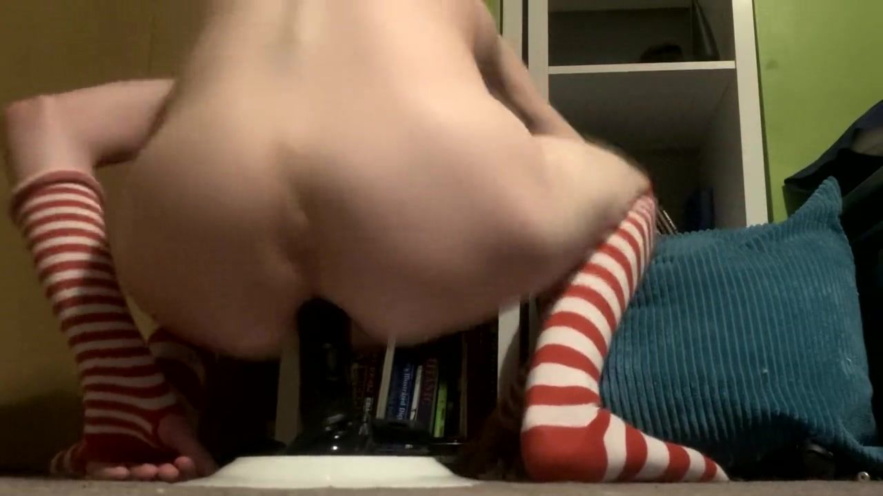 I ride a big black dildo, I was almost caught while riding. I jerk myself off a little and show off my cute little sissy pussy!