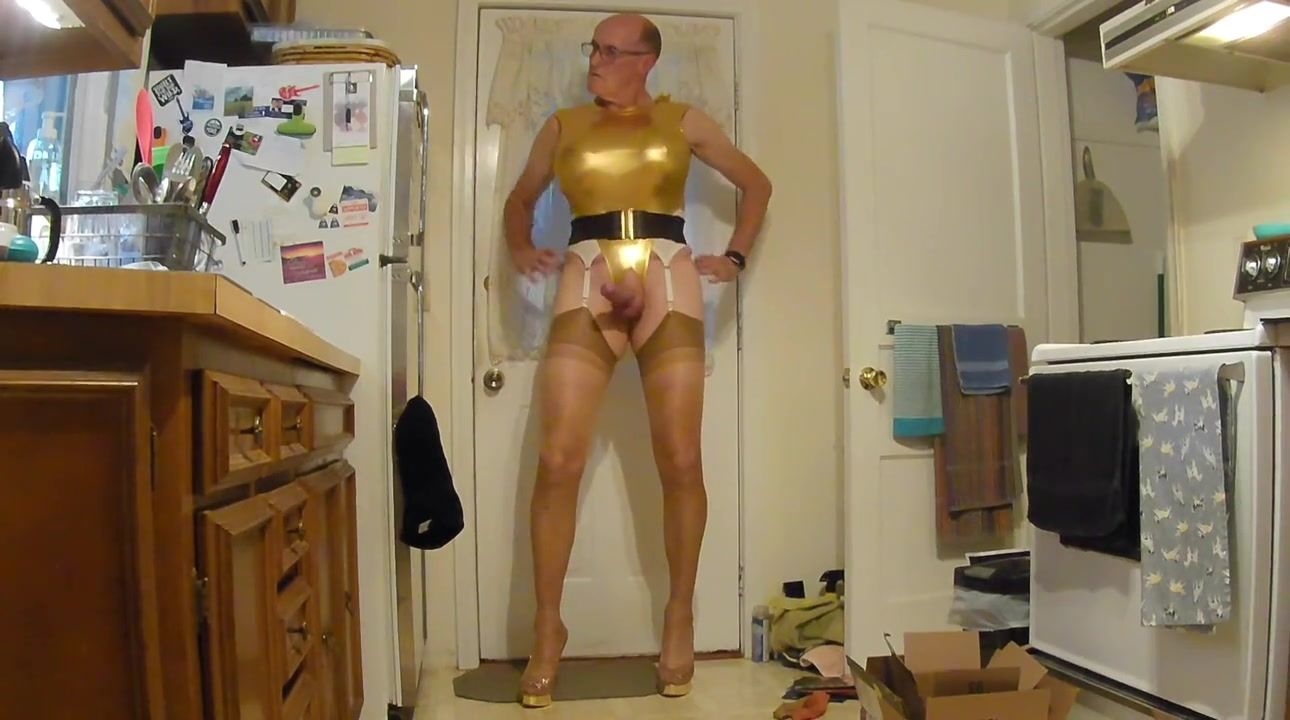 gold leotard, with my gold sparkly super-high heels. wanking to cum in the kitchen.