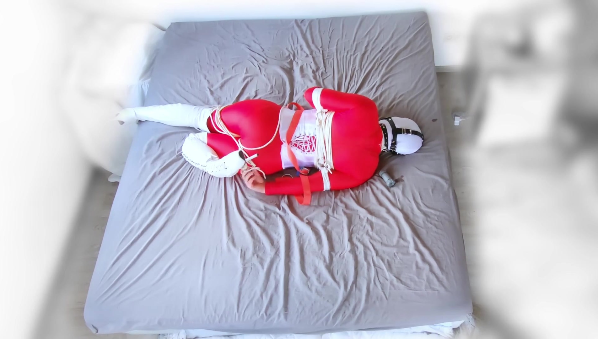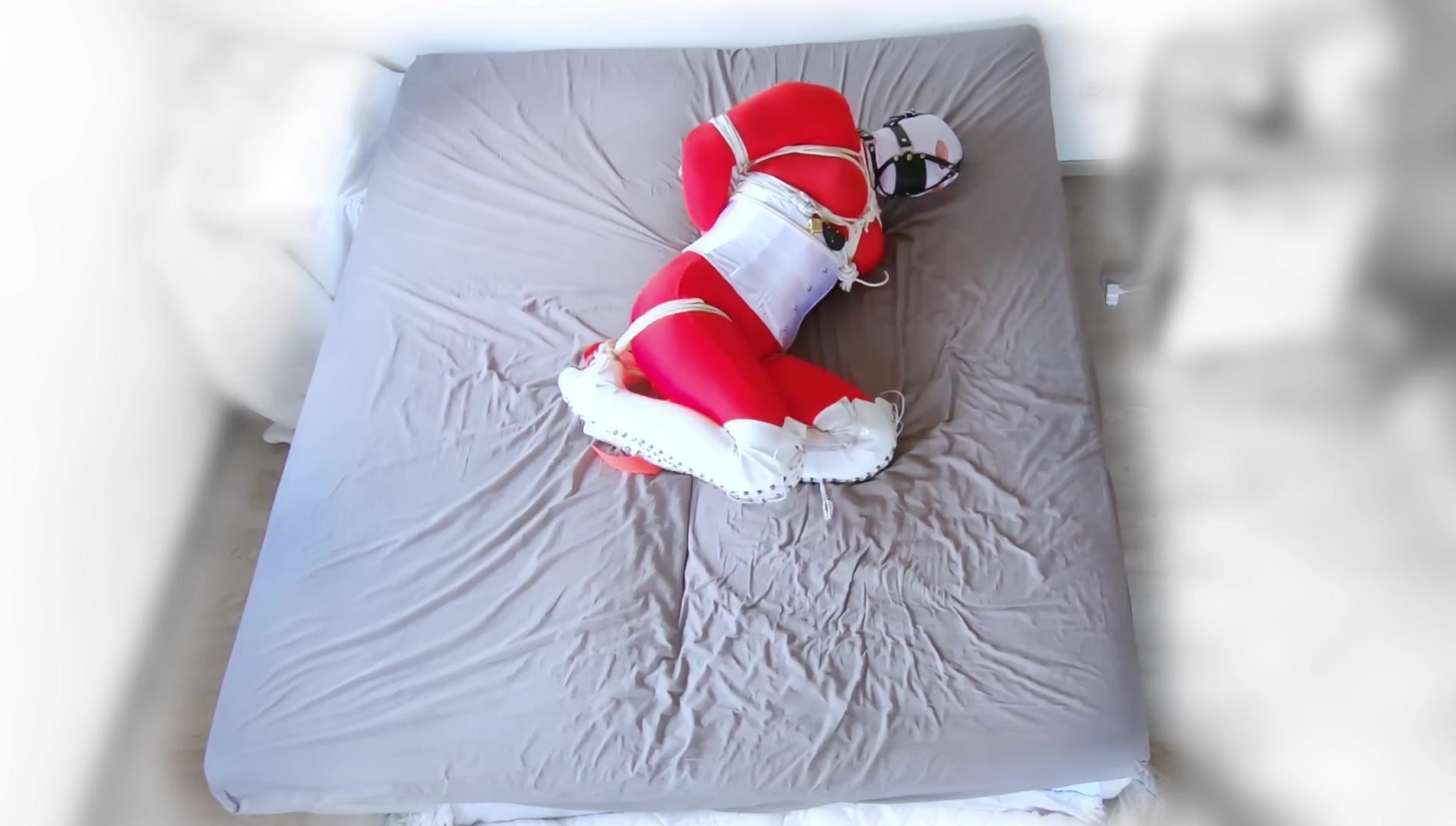 Crimson catsuit white footwear selfbondage