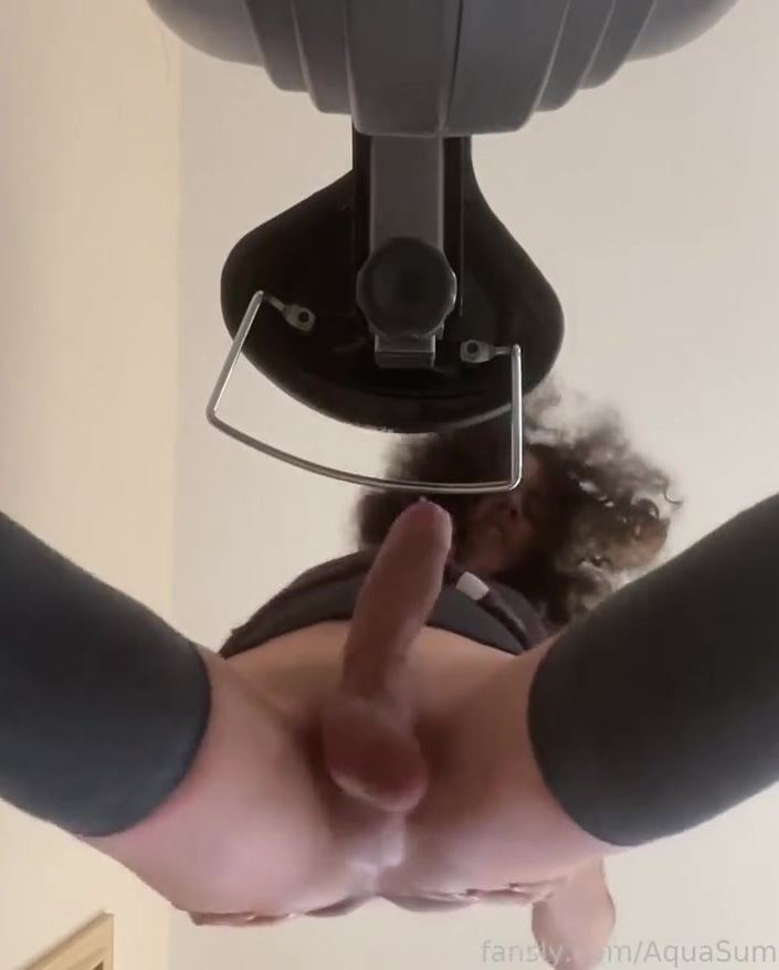 femboy in rosy undergarments sits astride a long meaty fake penis