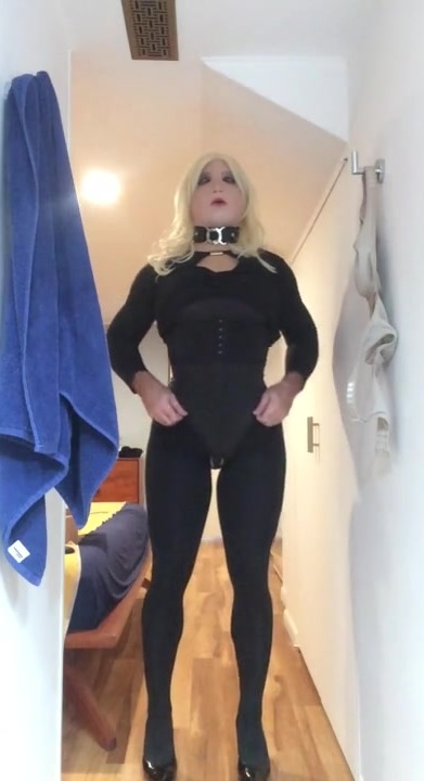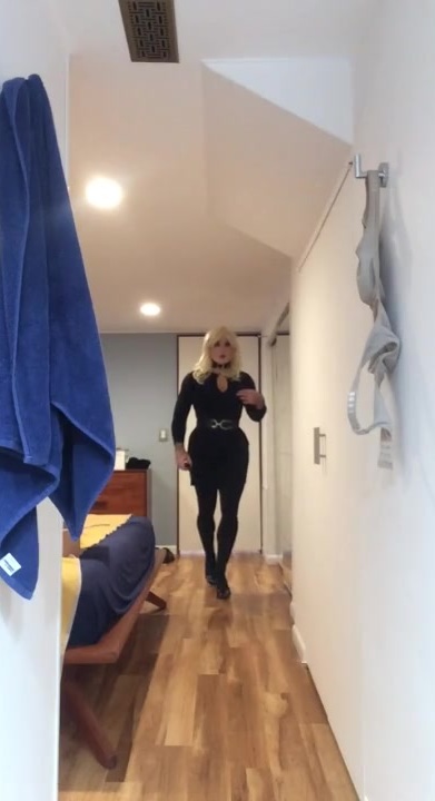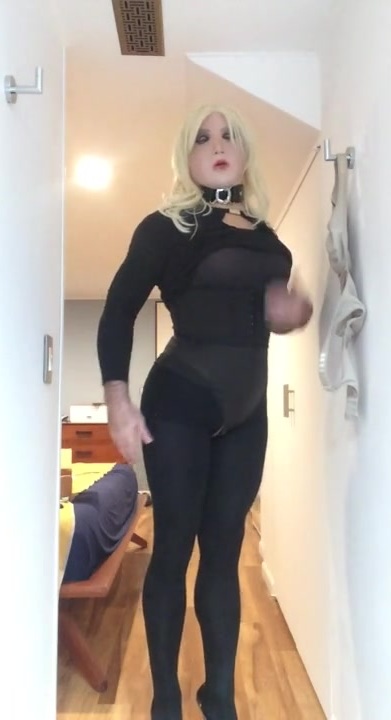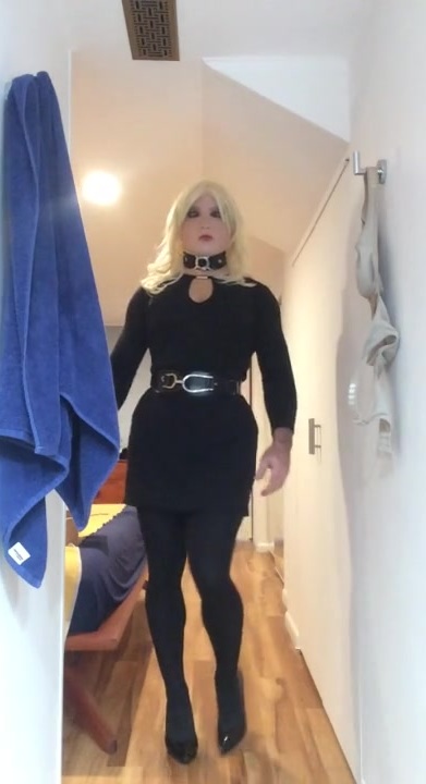 Brigitte's Black sundress (trans, crossdress, mask, dame mask, fetish, ash-blonde, tights, high high-heeled shoes)