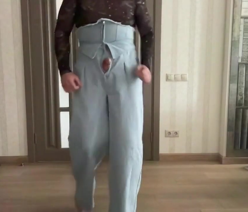 Crossdresser in blue high midbody harness denim, lash top and high high-heeled slippers jizz and dance for her DOMINATION & SUBMISSION tormentor like a cheating