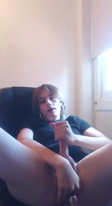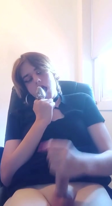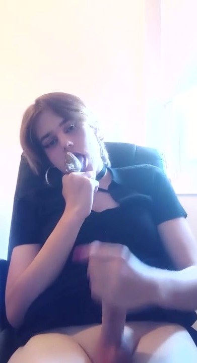 T-Girl masturbate her lil' knob and tongues his own spunk
