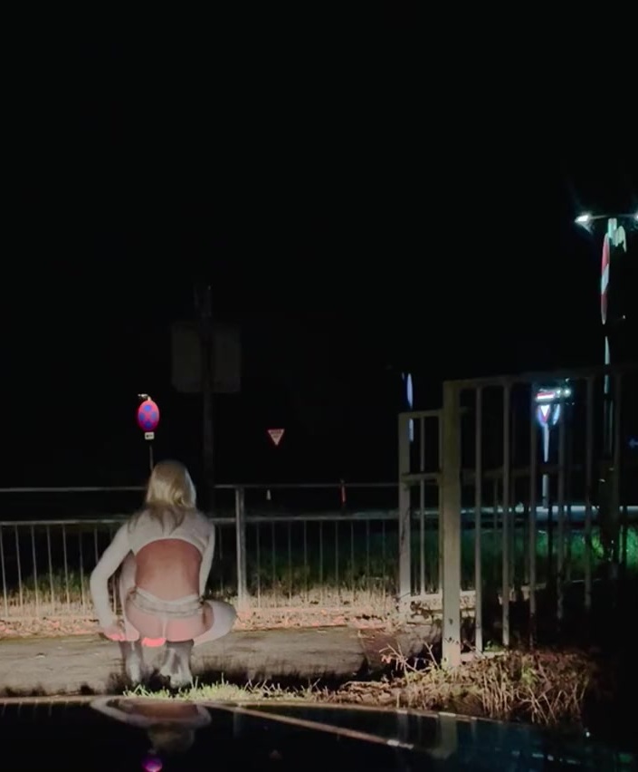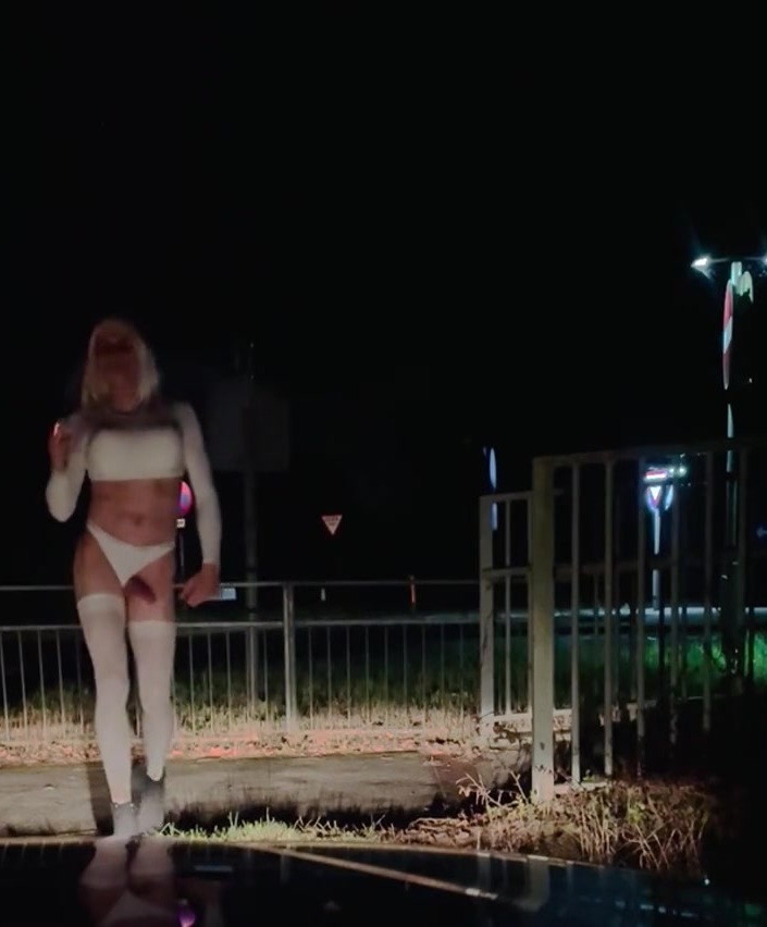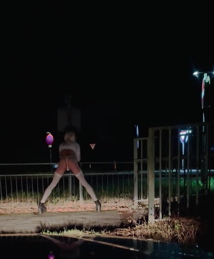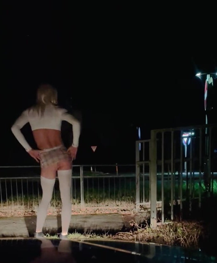 Showing in a spandex miniskirt by a engaged road on Saturday night