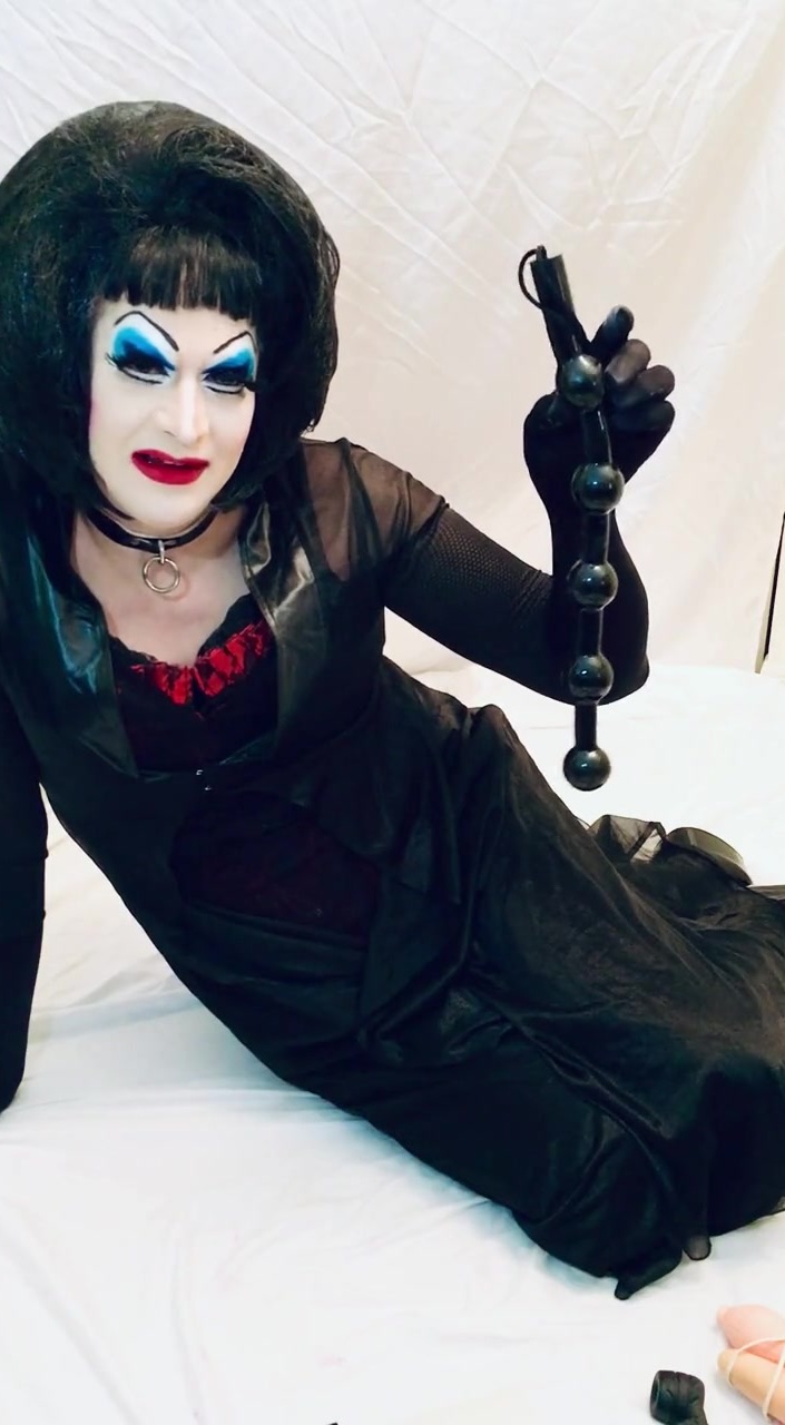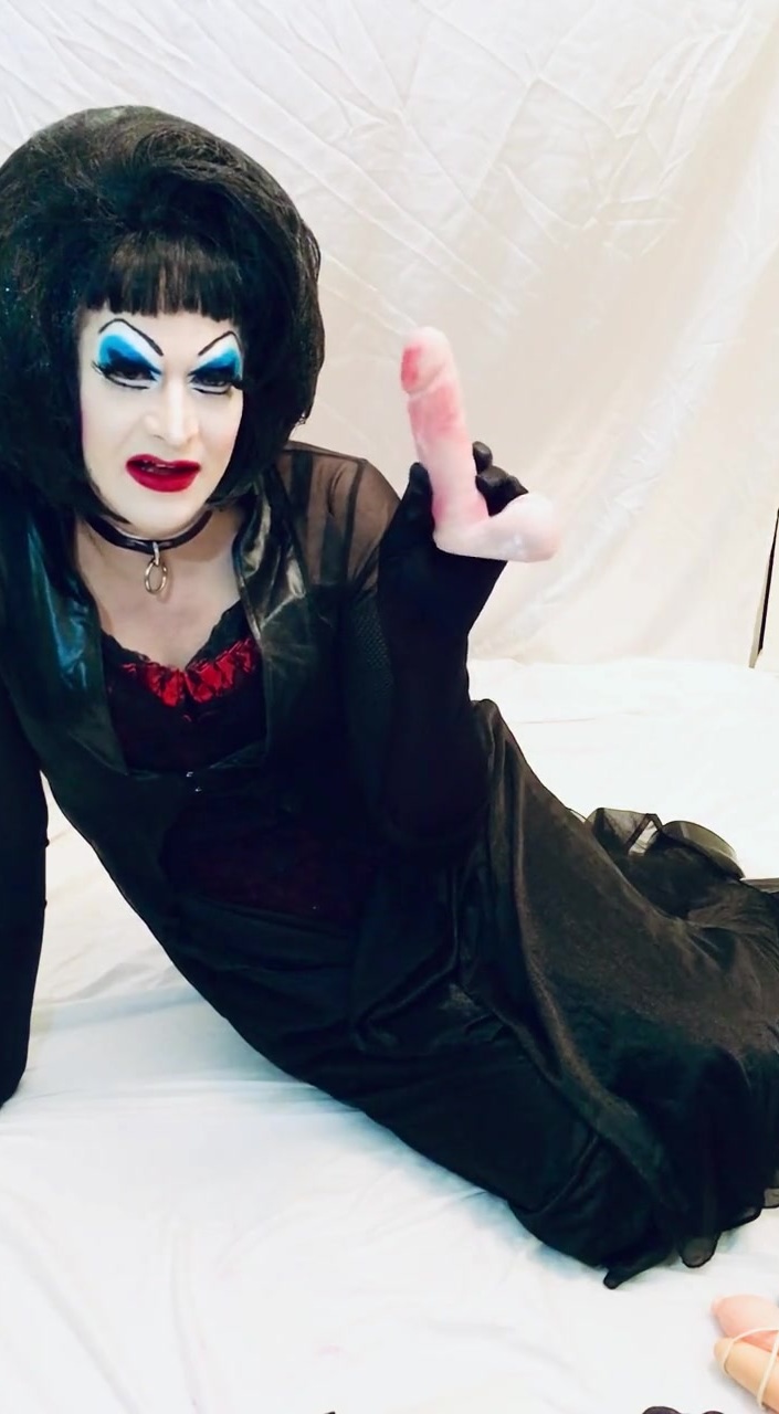 Heavy makeup slut shows off the toys she will use on herself to web cam room.