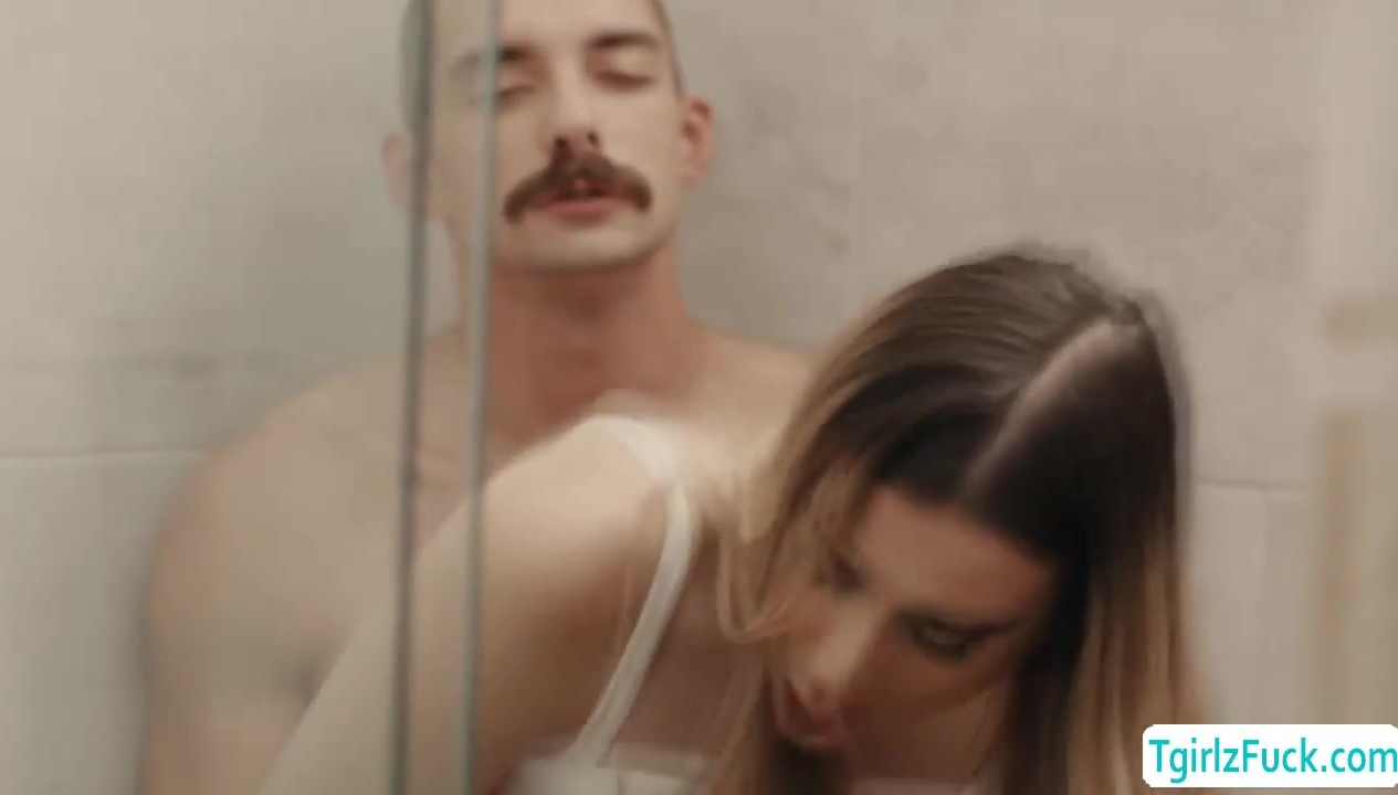 In the laundry room, busty blonde shemale Ivory Mayhem accidentally tore her pants while bending over thus Johnny B instantly anal barebacks her big ass doggystyle. In return, the big tits tbabe deepthroat blowjob his huge dick and rides it in the bathroom while masturbating.