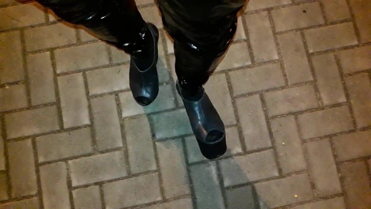 a crossdresser in high ram platform footwear and spandex stretch pants is ambling the streets at night