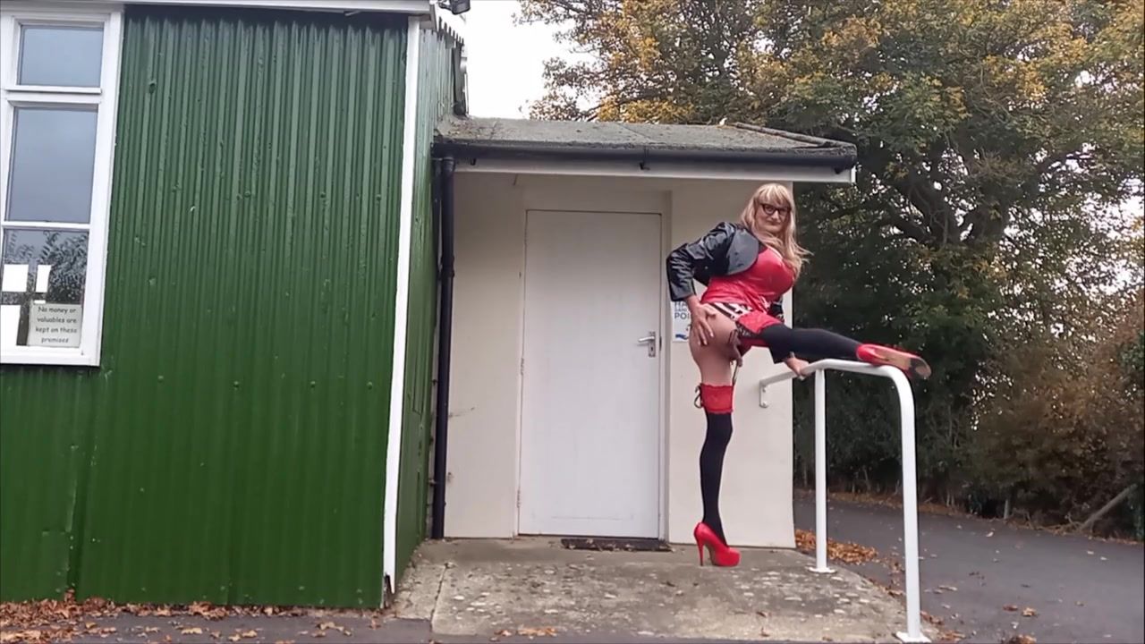 Transgirl Gina Trent Outdoors in vinyl peeing and posing
