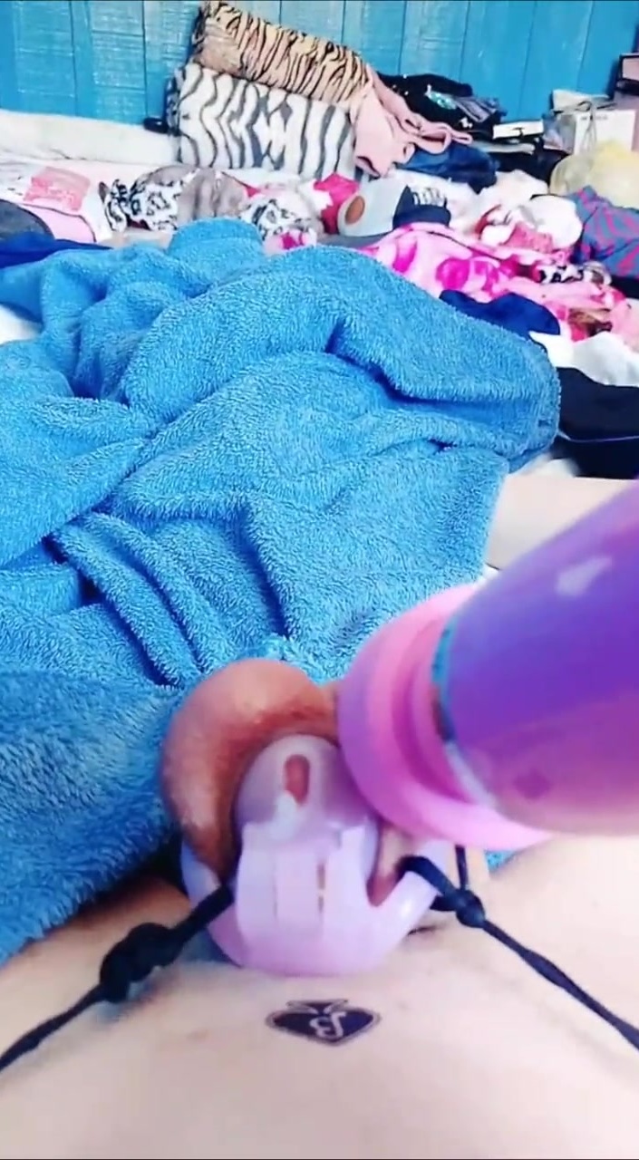Encaged sissy decently tugging with screwing machine and magic wand until sissygasm