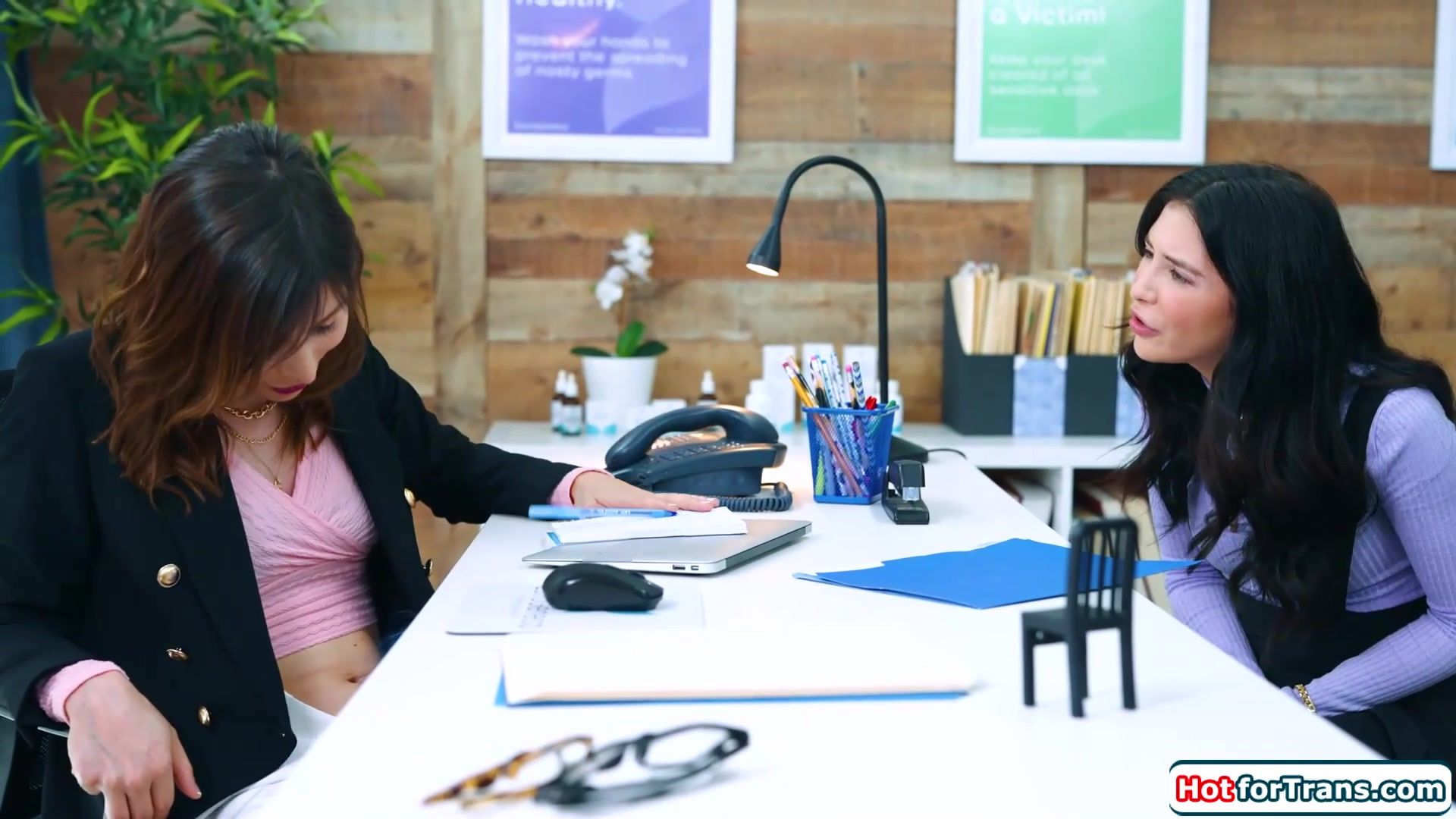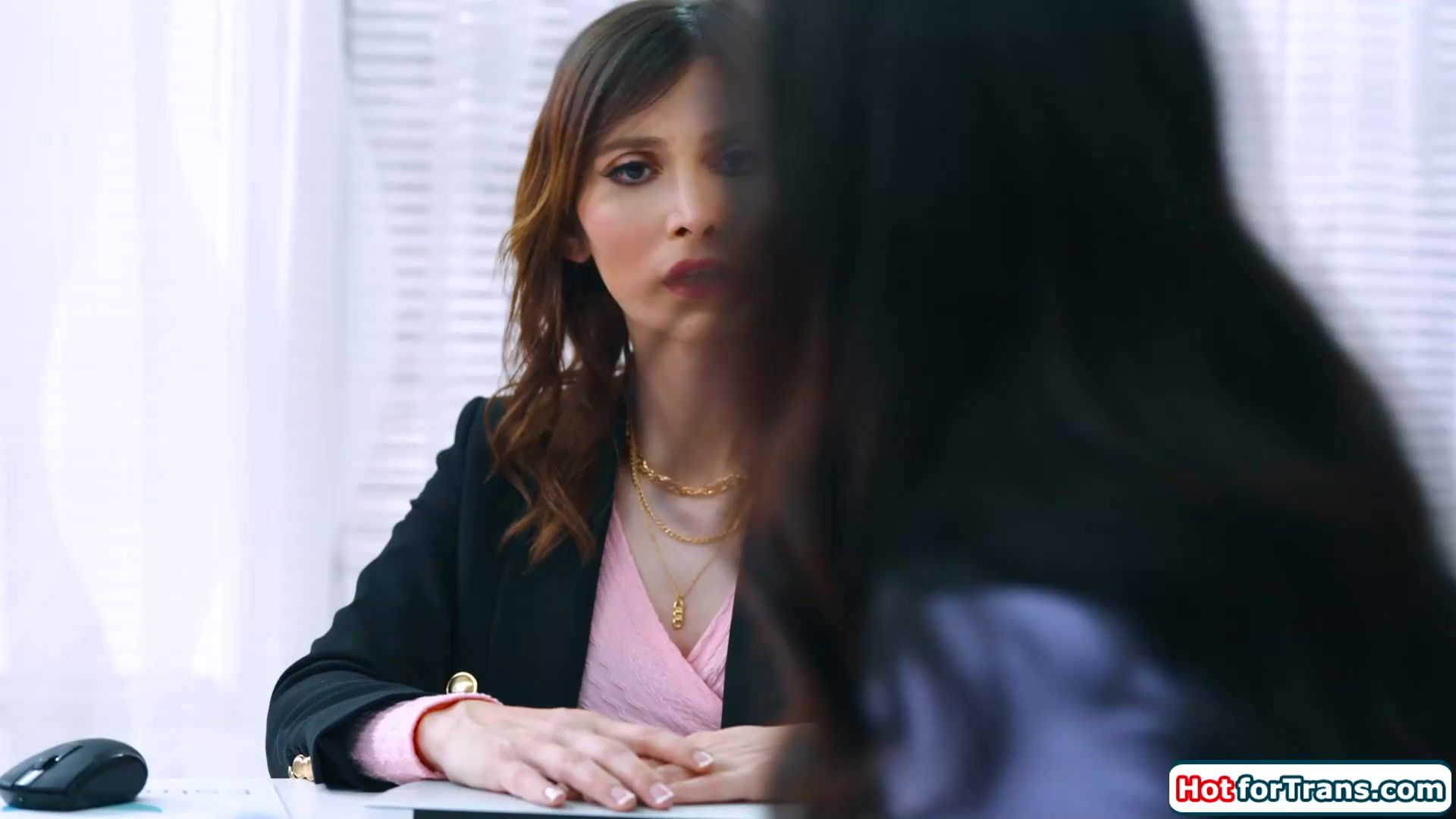 Intern tells HR trans Korra Del Rio that everyone fucks ifo her and finds out the shemale is sucked off as well.She tells her big tits tgirl boss Jade Venus and is surprised the busty ts makes her deepthroat ifo her colleagues before shes banged