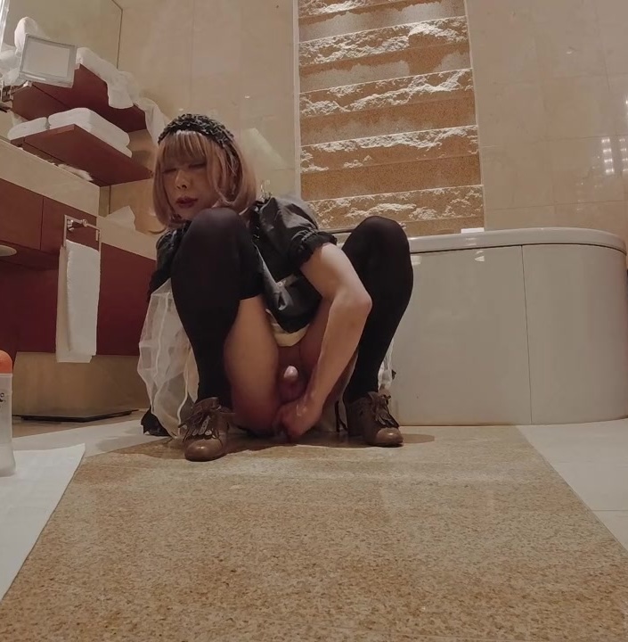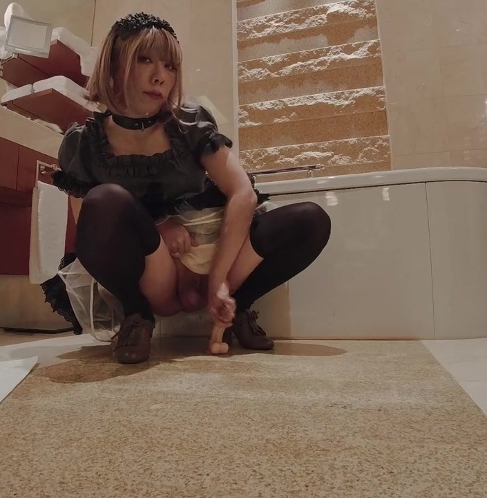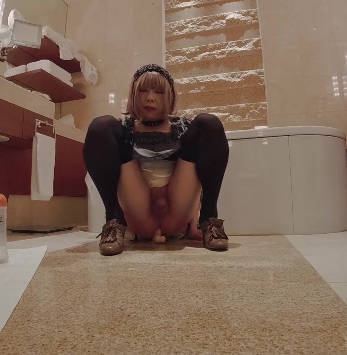 Chinese crossdresser in a motel douche dressed in a maid's costume and doing anal invasion have fun with a fake penis.