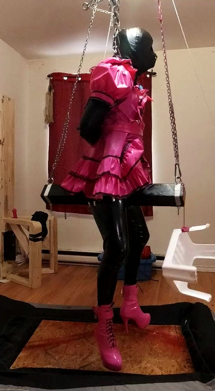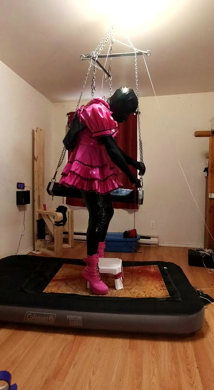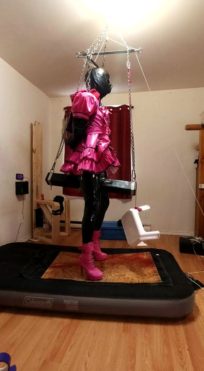 arms strapped behind me... balanced by suspension harness under maid dress... once the air mat deflated that huge black dildo slide way up in my tight ass and didn't come out until the ice melted...