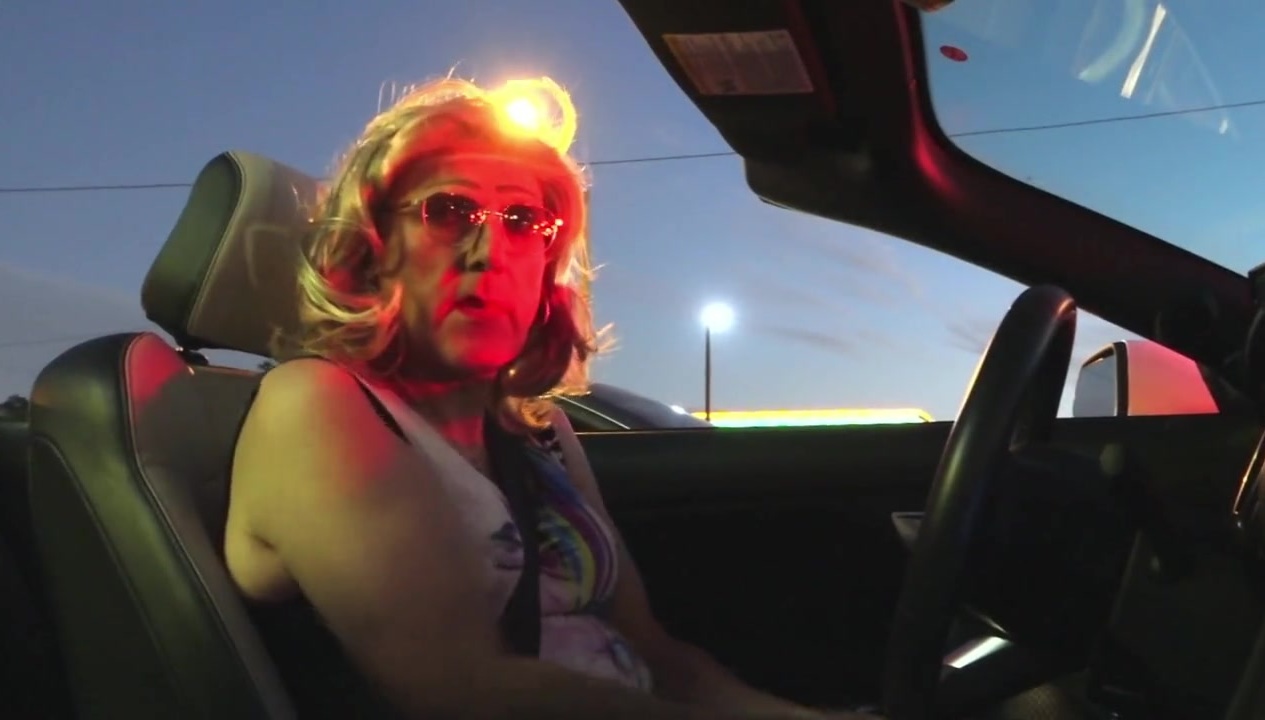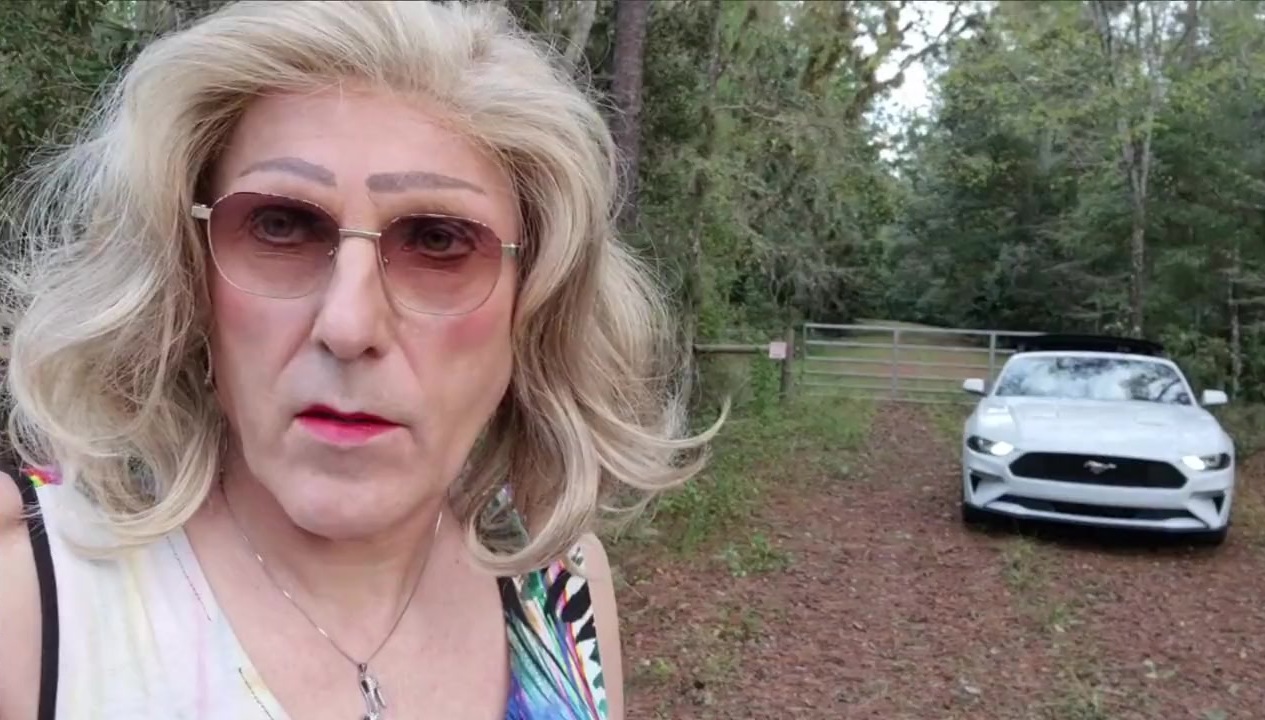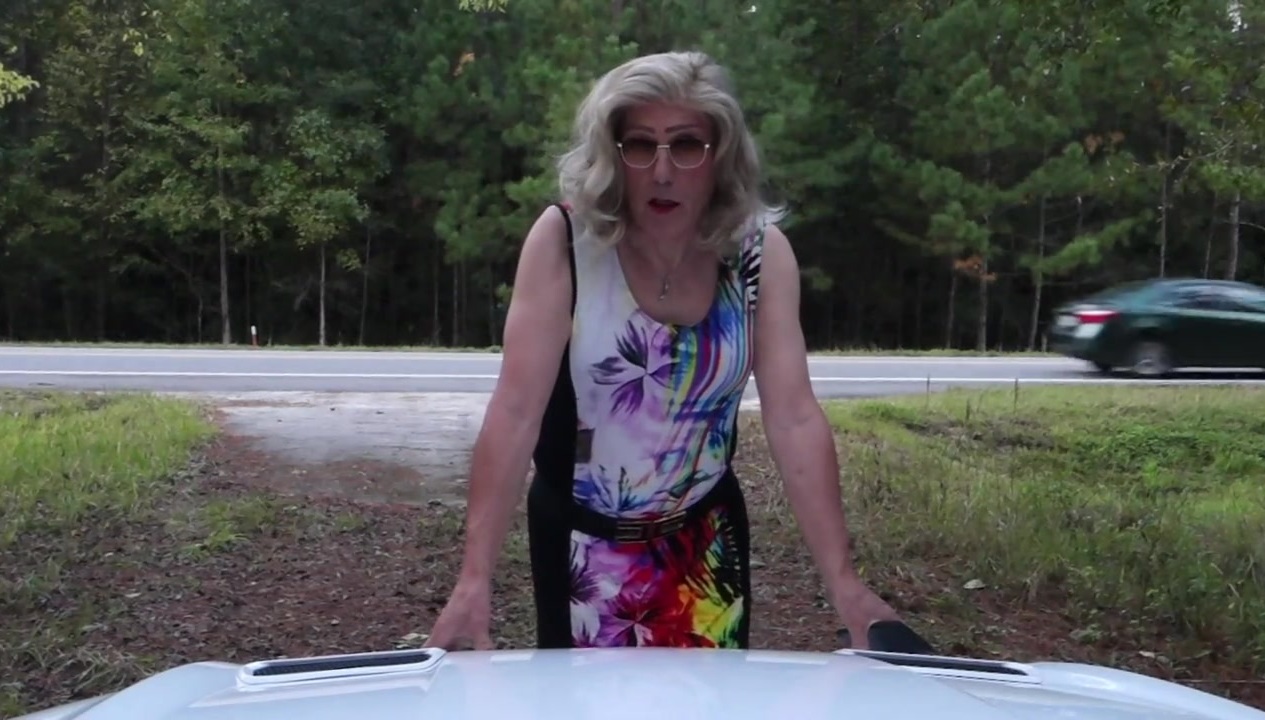 Mrs Samantha in the woods in her white Mustang, chased by a farmer in a big truck, almost locked in a park by a Ranger, but enjoying herself driving and walking around and teasing with naughty poses!