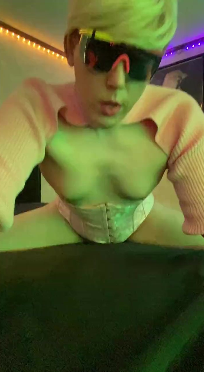 trans girl jerking off and playing with her tits in the bed. flat chested and big booty twerking.