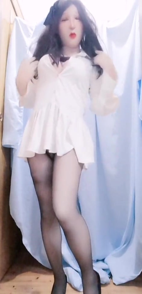 Femalemasked transgender girl in black nylon tighs pantyhose and high heels playing her pussy
