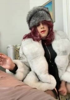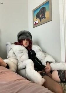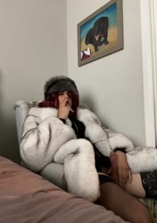 I enjoy a cigarette in my blue fox fur coat and silver fox fur hat