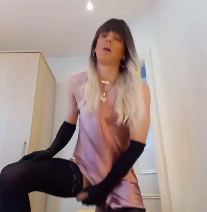 jess silk railing fuck stick in rosy satin nightie with blondie periwig