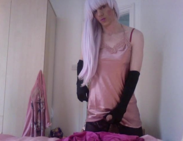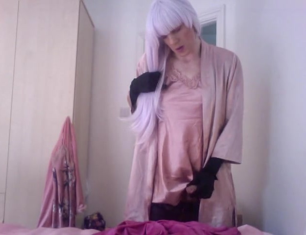 jess silk railing fuck stick in pinkish satin nightie and bathrobe with long purple peruke