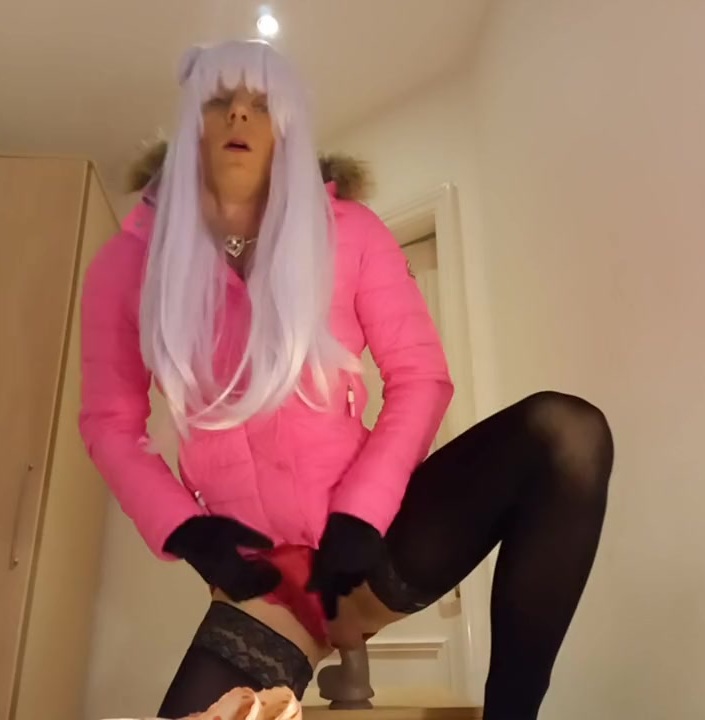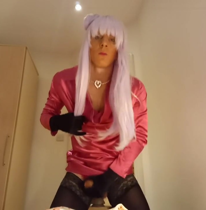 jess silk railing fuck stick in rosy satin nightie with blondie periwig