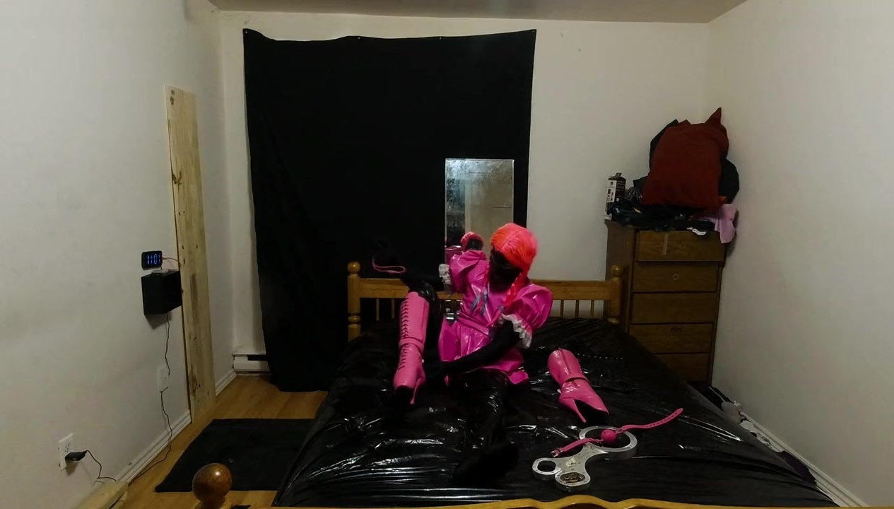 trying new chastity belt out and good old ice cube in a stocking thumb tacked out of reach to the ceiling. my favorite purple dildo locked tight and secure in me ass and gagged with one of me larger