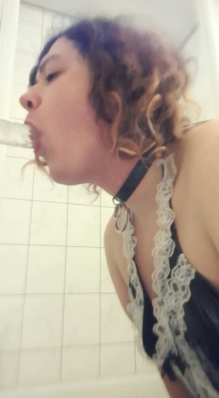What a lovely way to Start the Day XD Right after bed i got on my knees to suck this transparent Dildo AND YES i slept with this lace maid dress and collar and even handcuffed, like a slave should xD