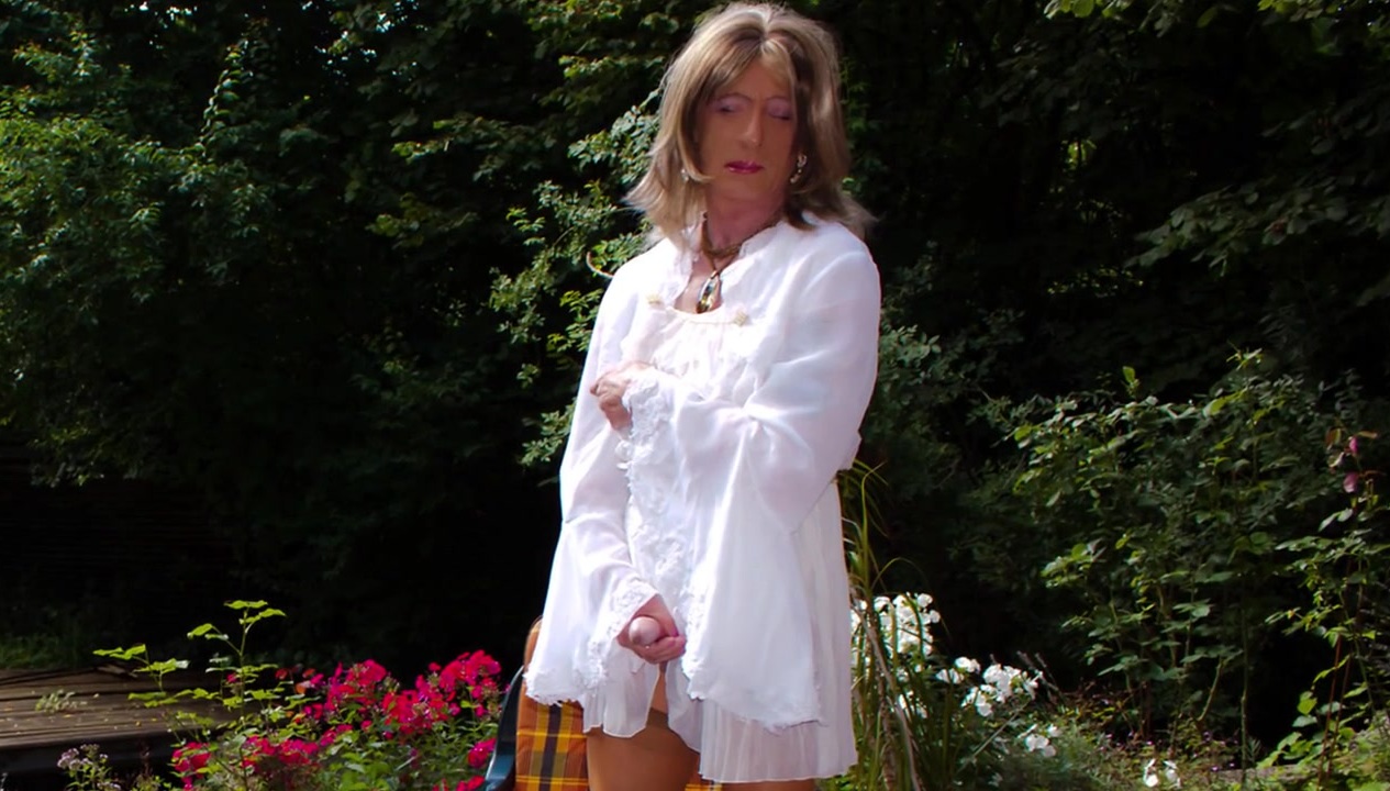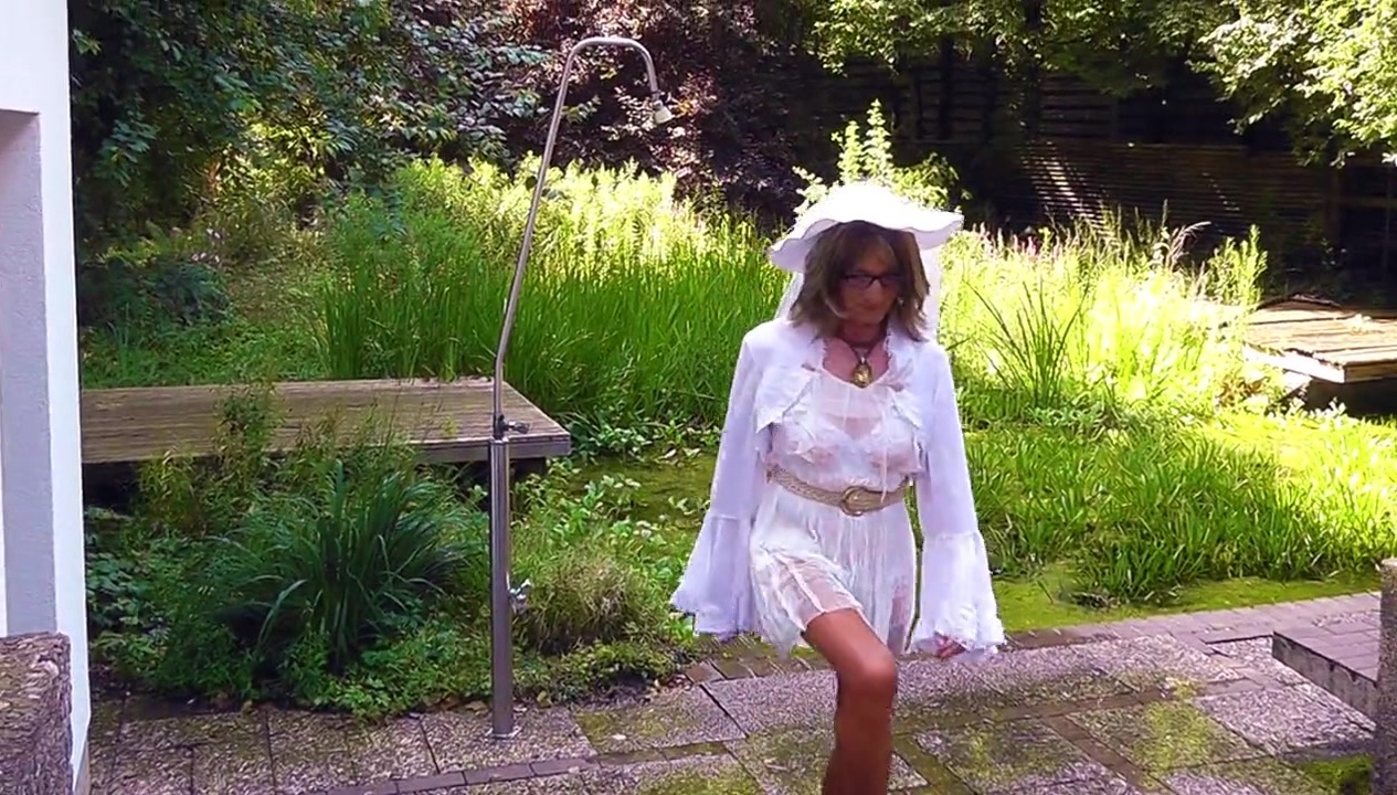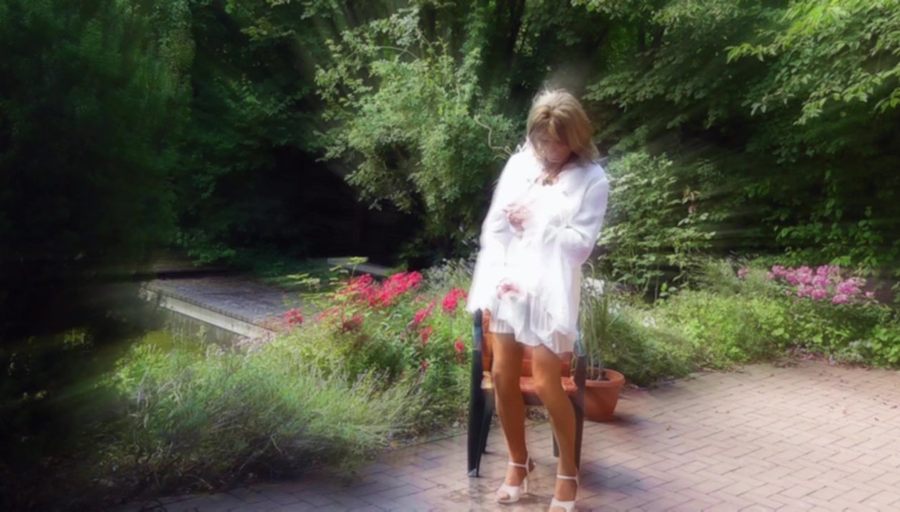 Money-Shot Pixie - outdoor money-shot in a sheer humid gown and nylon stocking