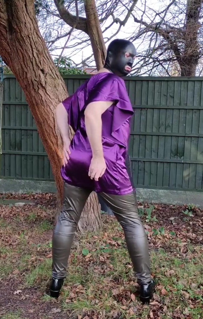 Super-Hot tv masked satin and taut glossy stretch pants outdoor