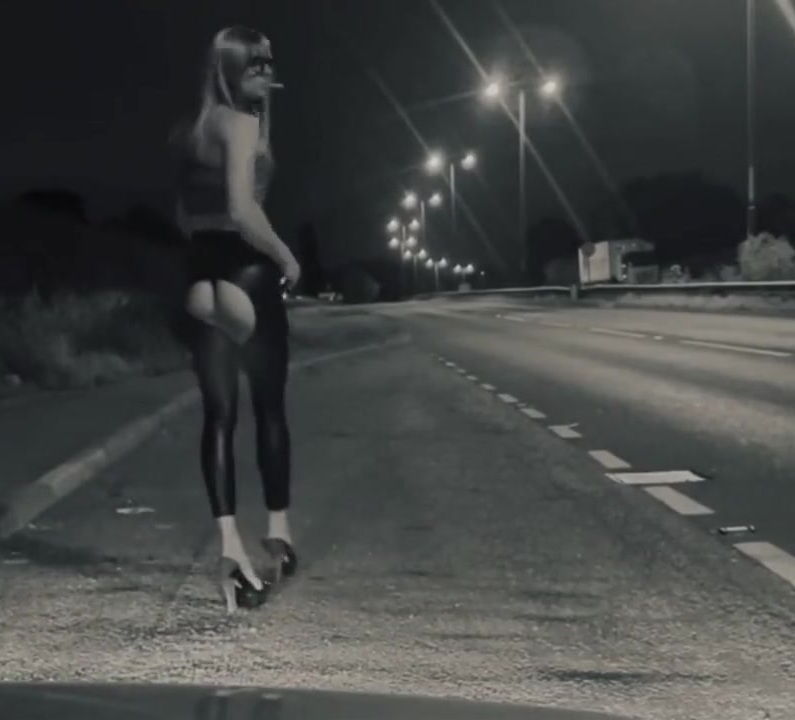 White haired slut in black and white dress