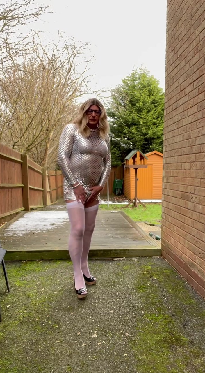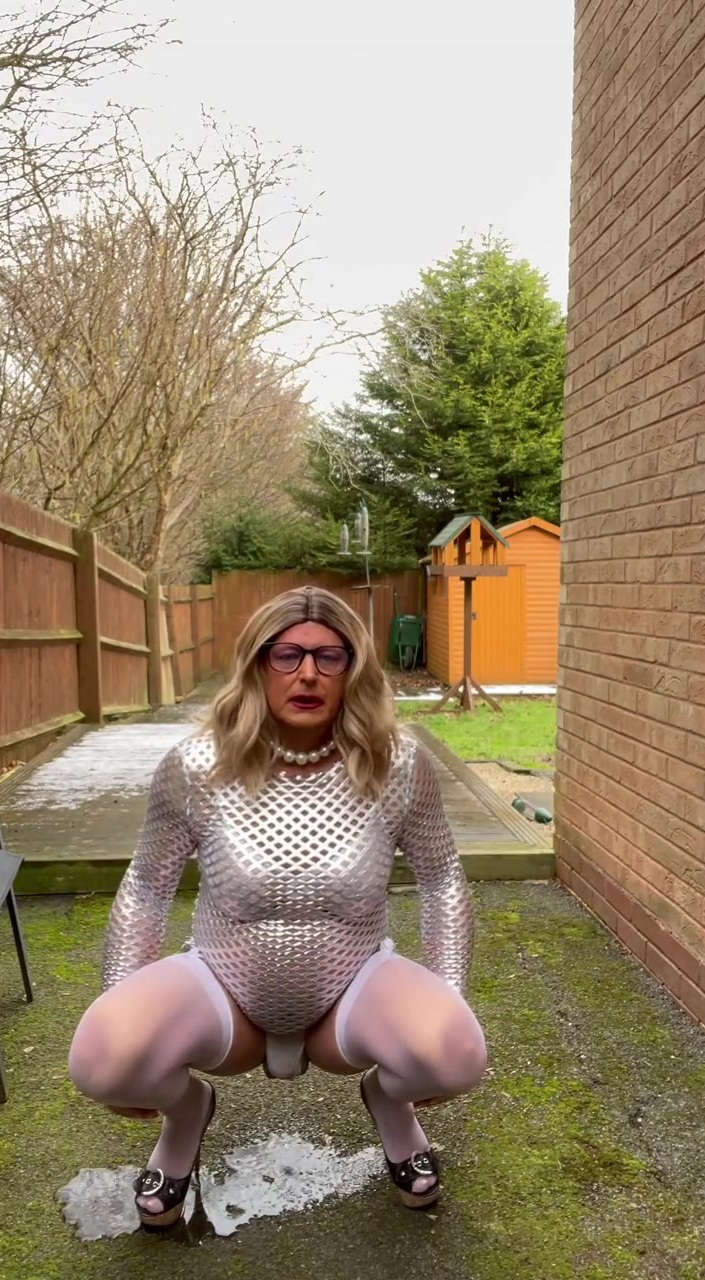 Fledgling crossdresser Kellycd2022 glorious cougar pissing her underpants in tights high-heeled shoes vinyl sundress outdoors