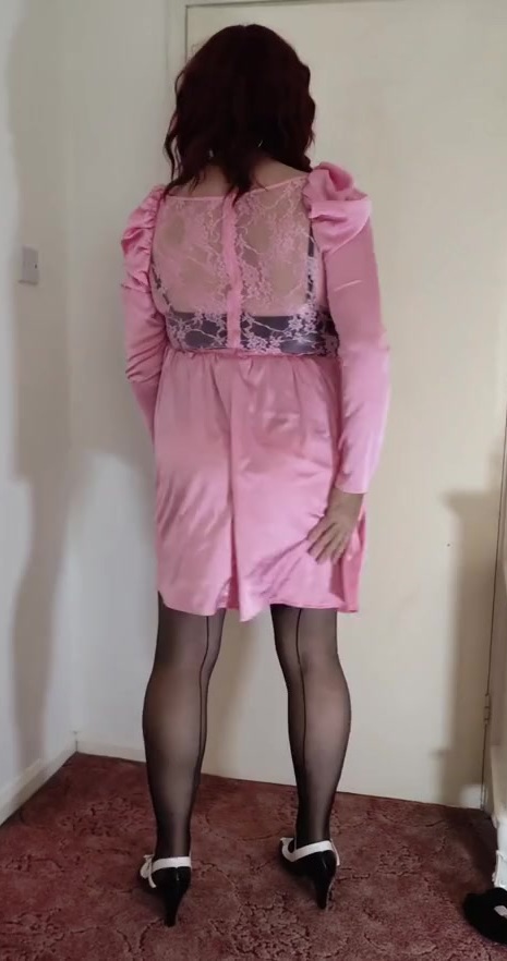 Hot caged tv crossdresser in pink sissy satin dress with stockings.