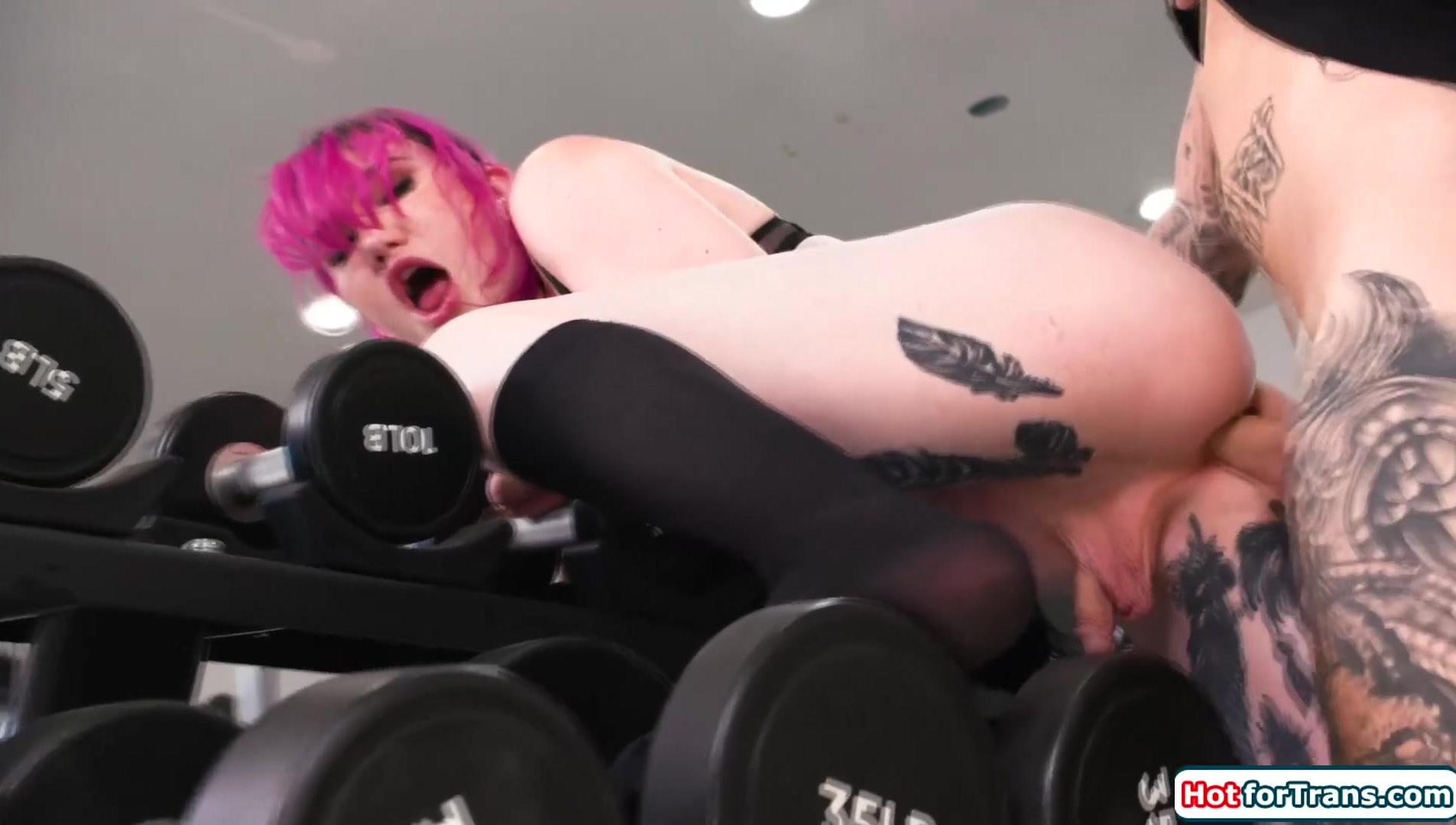 Stuck tattooed shemale babe Lena Moon wants help but the guy first wants to lick her ass.The tgirl sucks his big cock in order for him to release her.As a reward he doggystyle barebacks the tranny.Then the pink haired trans babe anal rides