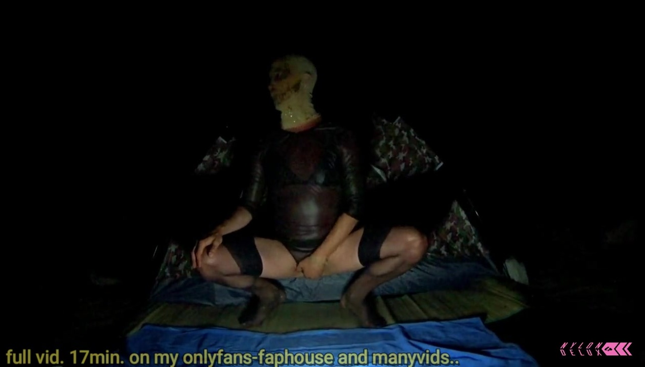 nylondelux in nylon camping in the darkness. black sheer dress, garter and stocking tease..