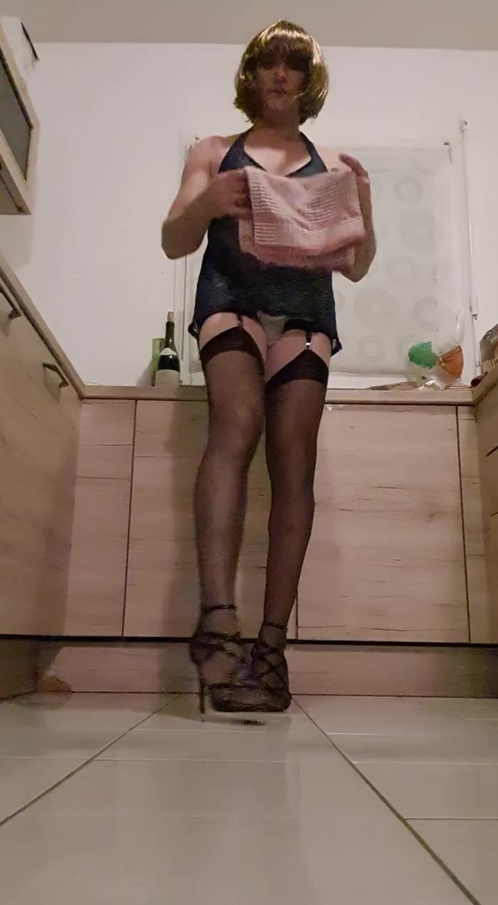 Krissy Sweets jacking her she man meat in high high-heeled slippers and underwear ...