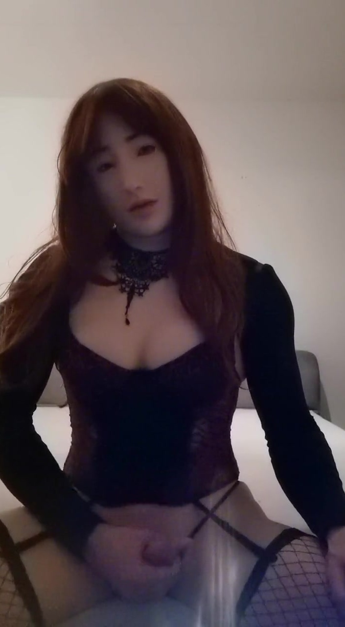 Redhead Samantha enjoys a nice handjob in lingerie, fishnet stockings and high heels till she cums