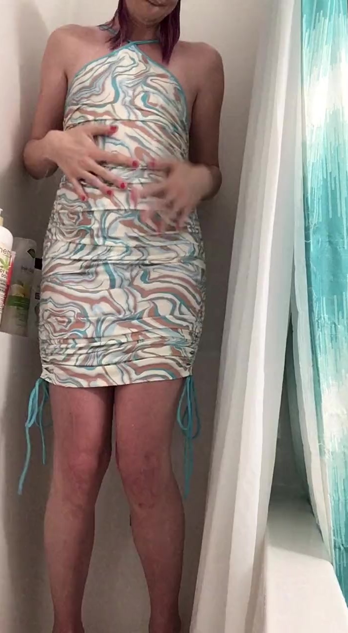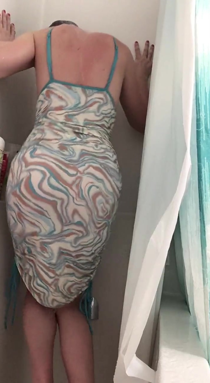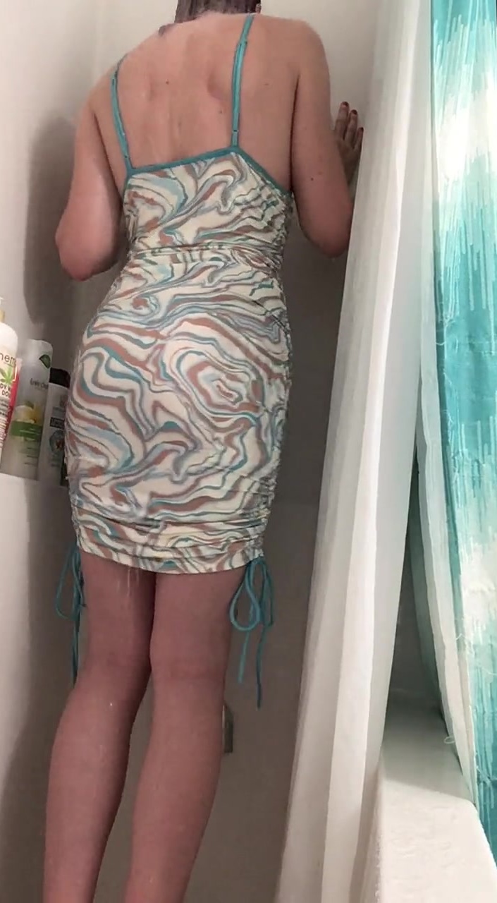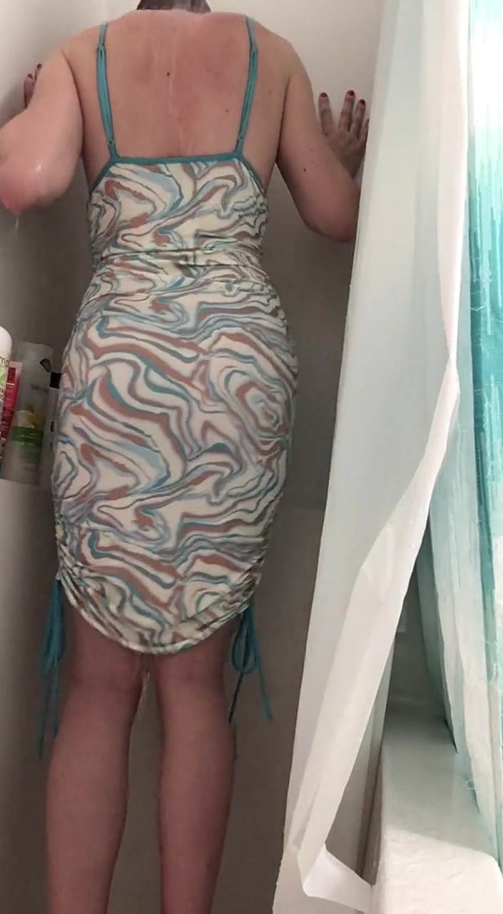 Stepping into the shower in her beachy club dress and soaking her cares away