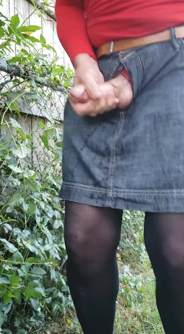 Crossdress outdoors urethral sounding. Jism on mini-skirt.