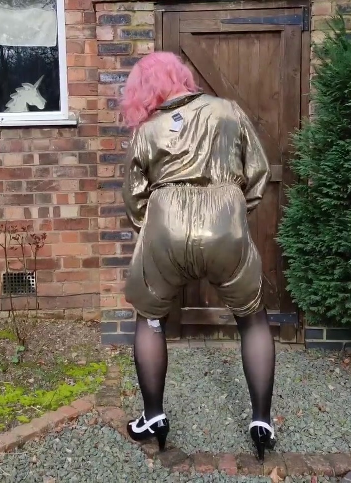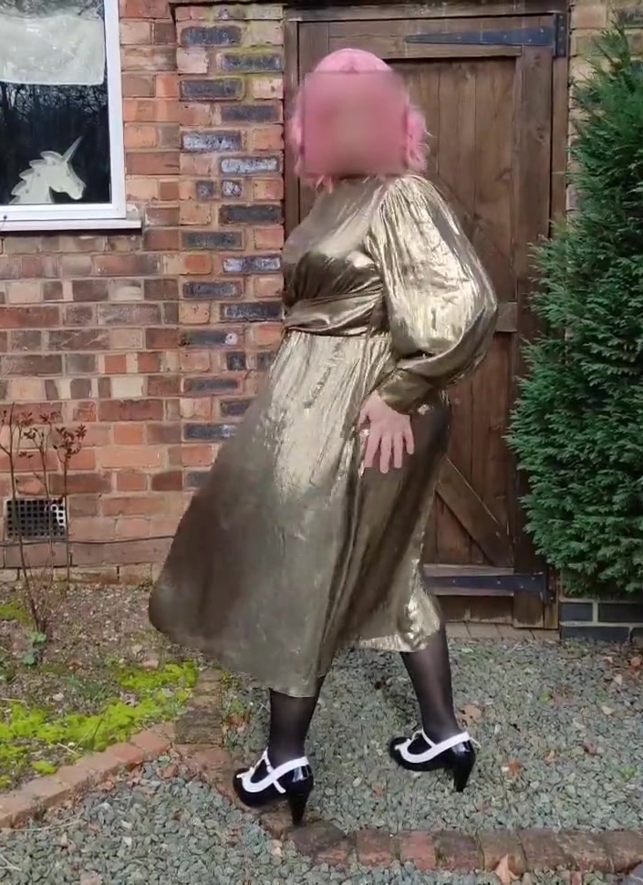 Hot sissy tv crossdresser Nottstvslut outdoors in gold metallic shiny sexy dress.