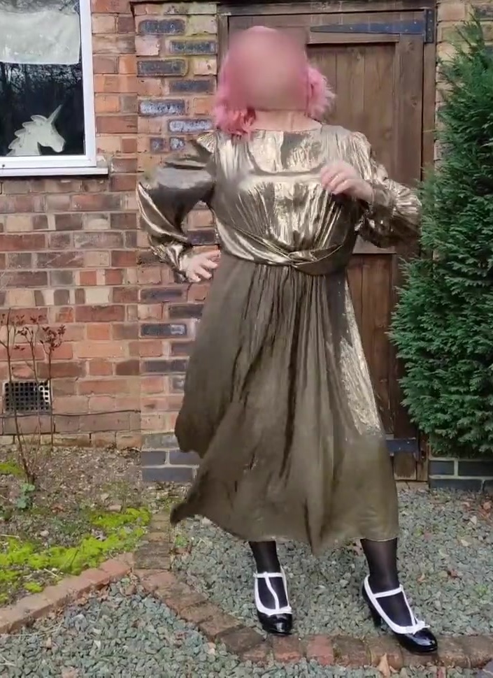 Sissy crossdresser outdoors in gold metallic glistening sundress