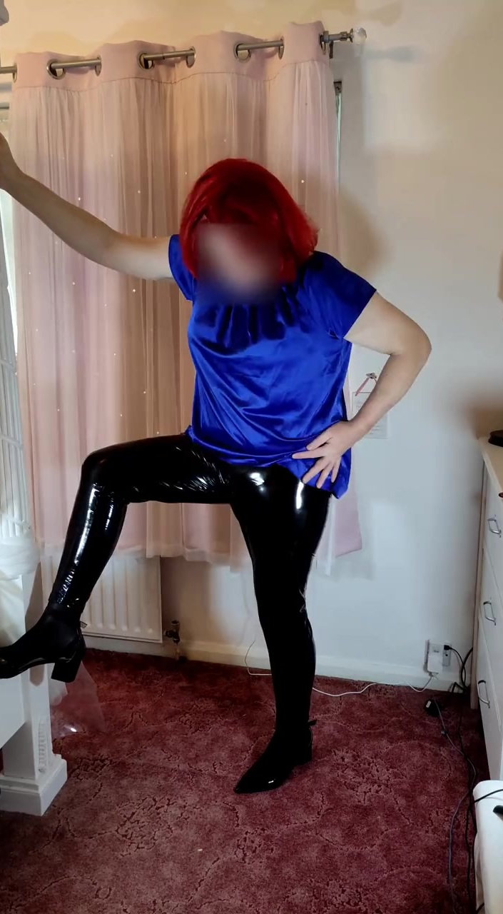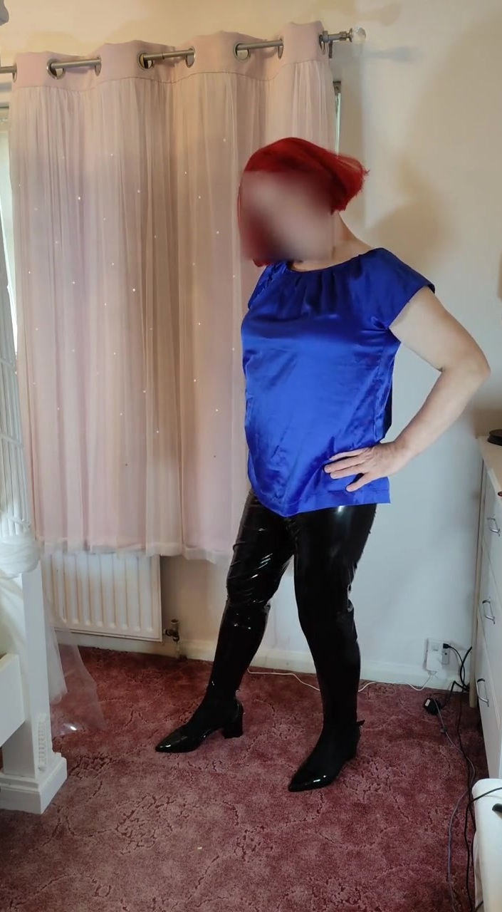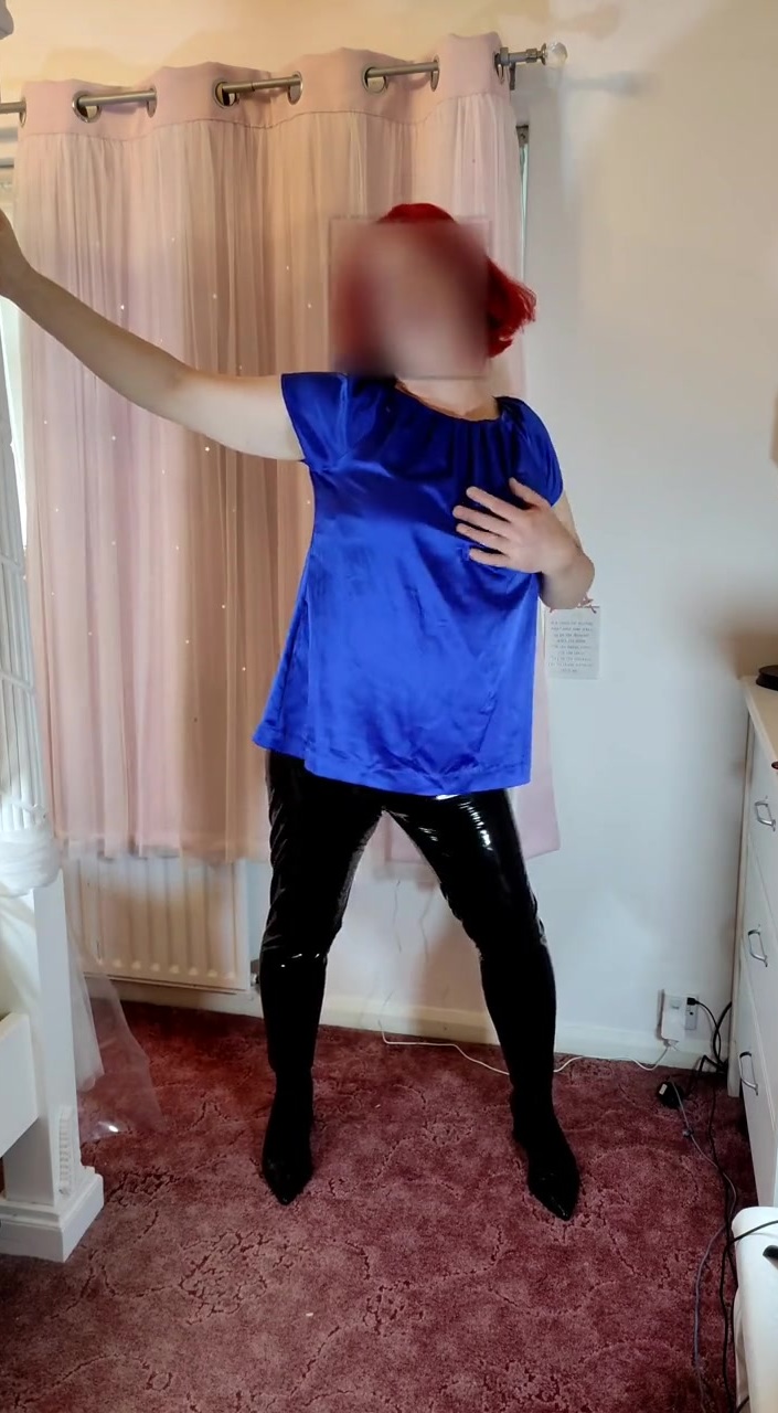 Hot sissy crossdresser Nottstvslut in satin blouse and shiny PVC leggings.